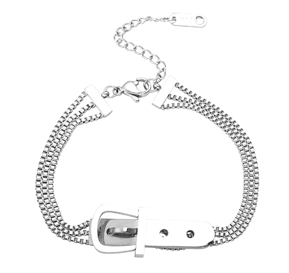 Njegova moderna zasnova, sestavljena iz dveh delov, povezanih z okrasnim elementom, ki spominja na sponko za pas, pritegne pozornost in se odlično ujema z različnimi outfiti, ne glede na to, ali nosite bluze, obleke ali puloverje.