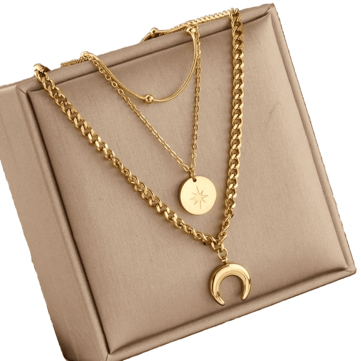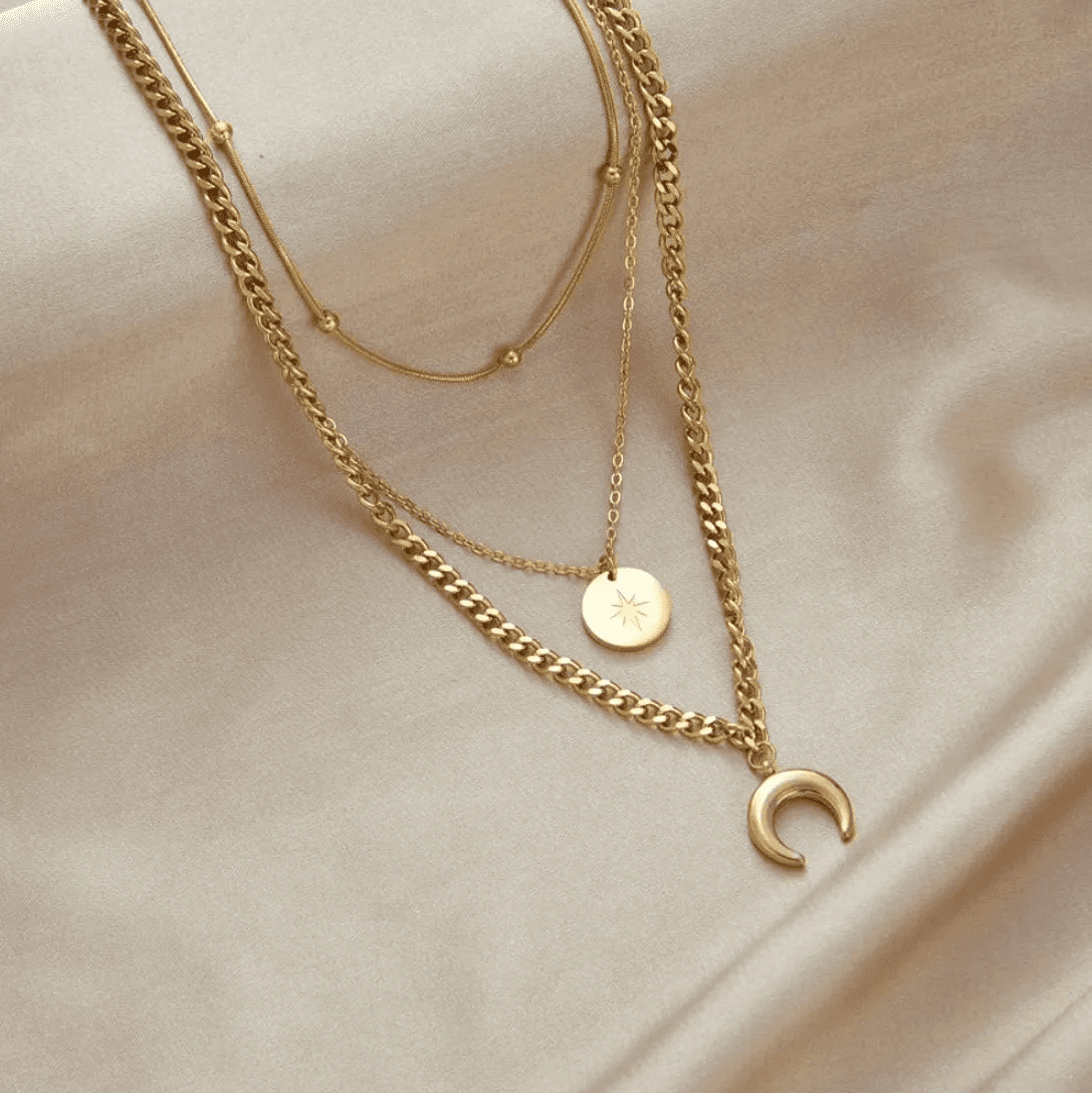 Odkrijte edinstven trojni ogrlica, izdelan iz antialergične kirurške jekla 316L, pokovane z 18-karatnim zlatom. Ta eleganten dragulj je sestavljen iz treh različnih verig: najkrajša z enakomerno razporejenimi biseri, srednja z majhnimi členki in najdaljša s klasično okovano povezavo. Obeski v obliki kovanca z izgravirano zvezdo in ornamentom v obliki polmeseca dodajajo ogrlici osebno noto, zaradi česar je idealen dodatek za vsakodnevno nošenje in slavnostne priložnosti.