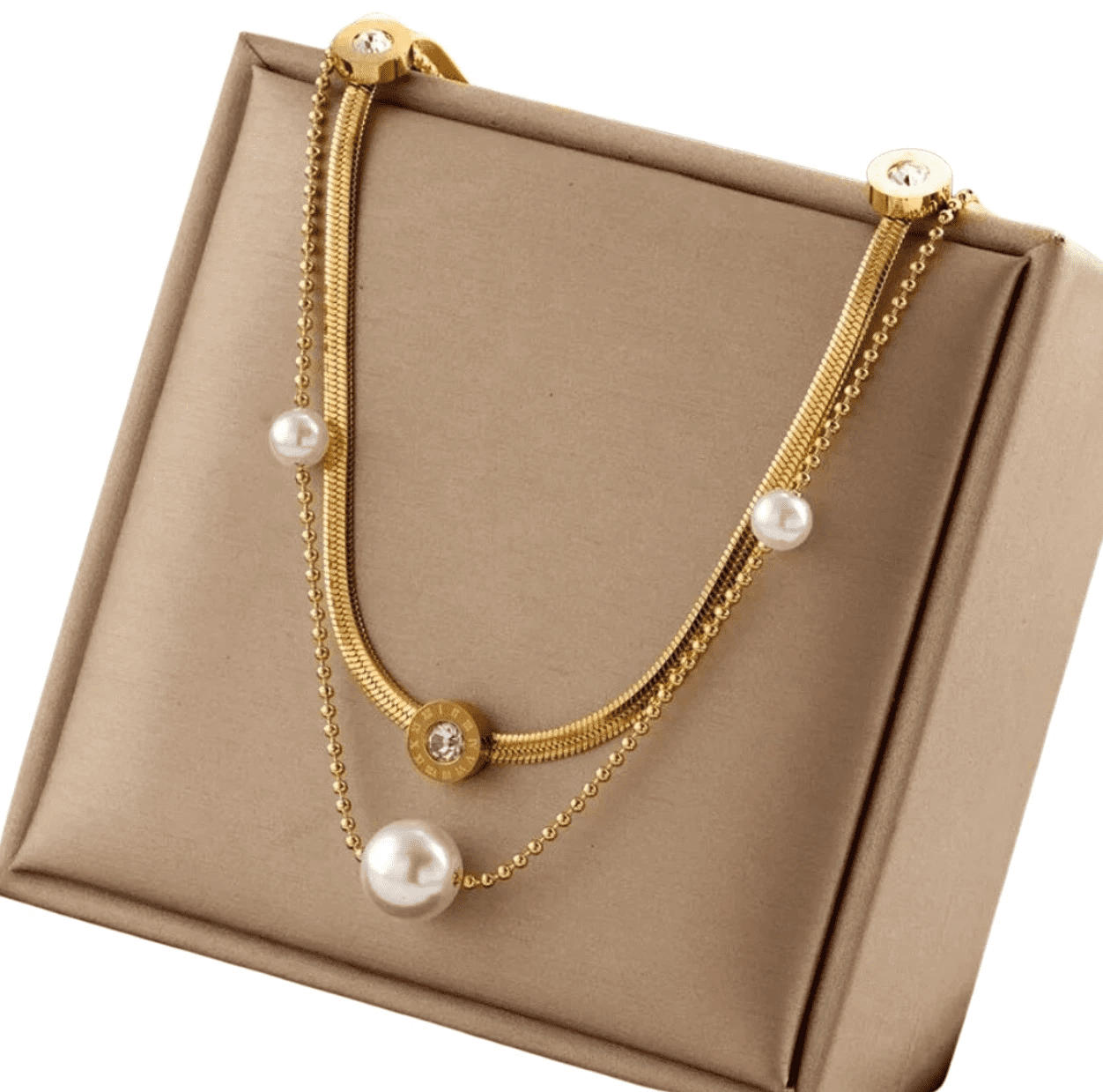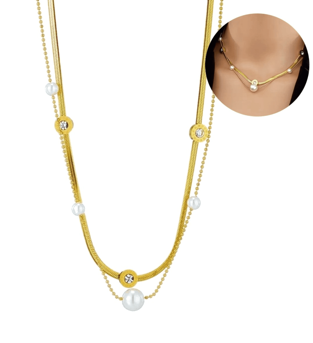 For Fun & Home Ogrlica iz kirurškega jekla 316L z dvojnim kačjim, pozlačeno z 18-karatnim zlatom, s perlama