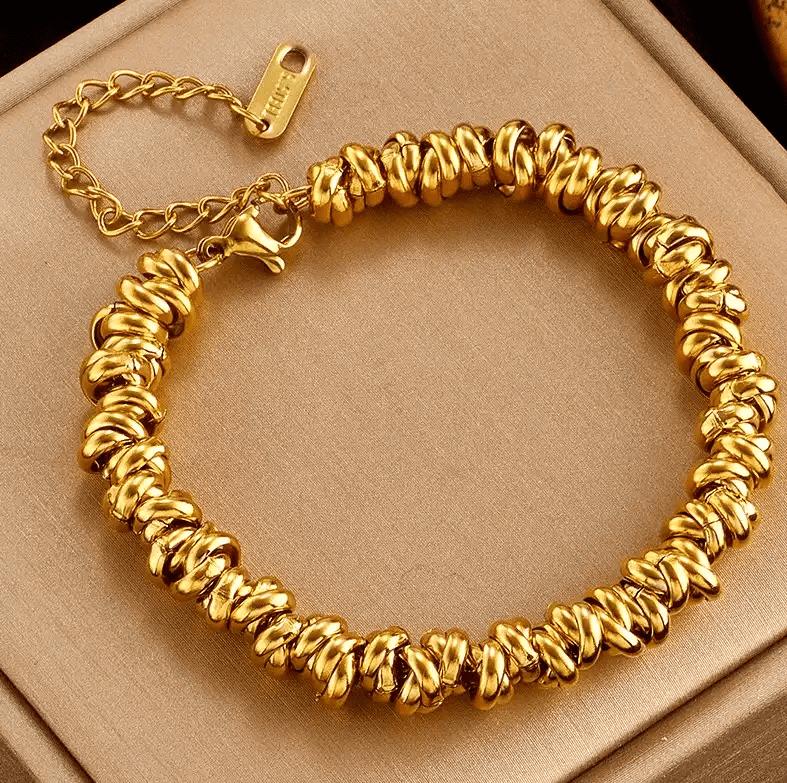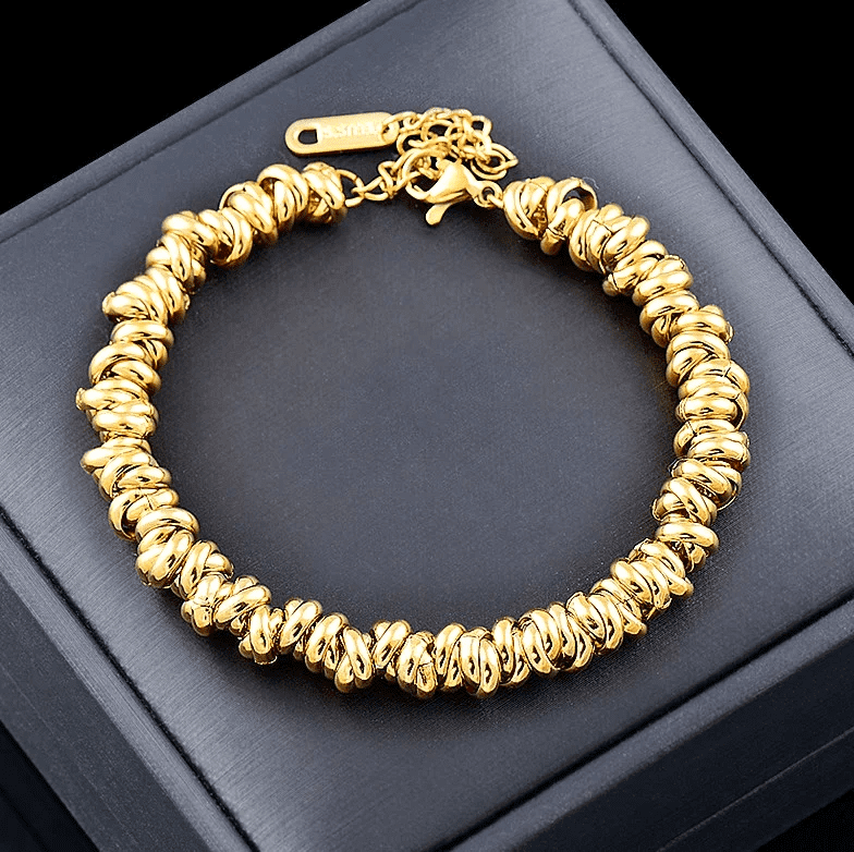 Elegantna zapestnica iz pozlačenega kirurškega jekla 316L je idealen dodatek za sodobne žene, ki cenijo povezavo stila in kakovosti. Zaradi površinske obdelave z 18-karatnim zlatom zagotavlja visok sijaj in odpornost proti praskam.