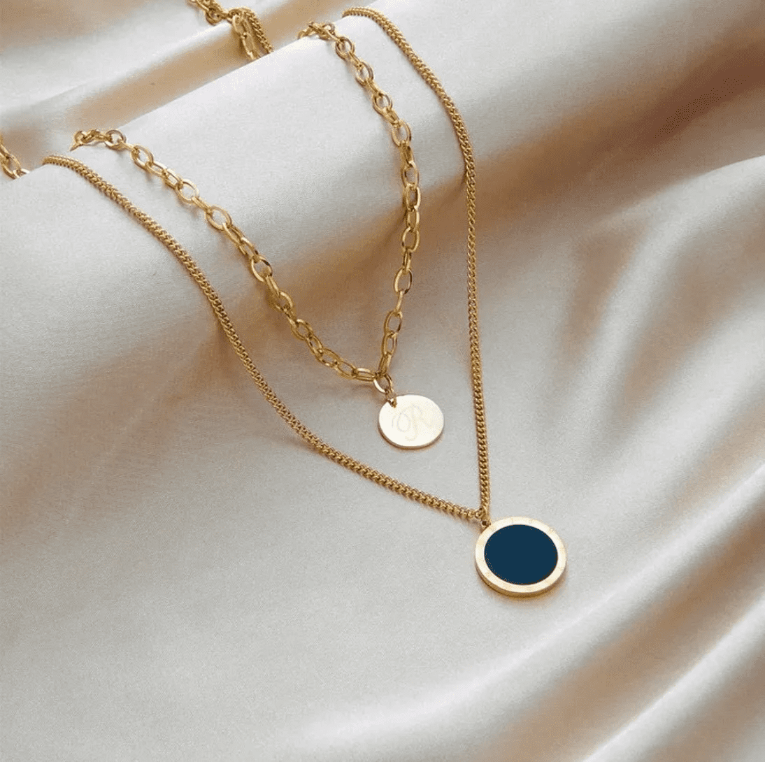 Ogrlica je sestavljena iz dveh verig – daljše oklepne dolžine 48 cm in krajše dolžine 40 cm, ki ji dodaja praktično podaljšanje 5 cm za enostavno nastavitev po potrebi. Okrašena je s kroglico zlatim obeskom s črnim središčem in rimskimi številkami, skupaj z zlatim ploščkom s črko R, kar predstavlja popoln dodatek k vašim elegantnim oblačilom in vsakodnevnim stilizacijam.