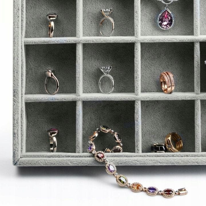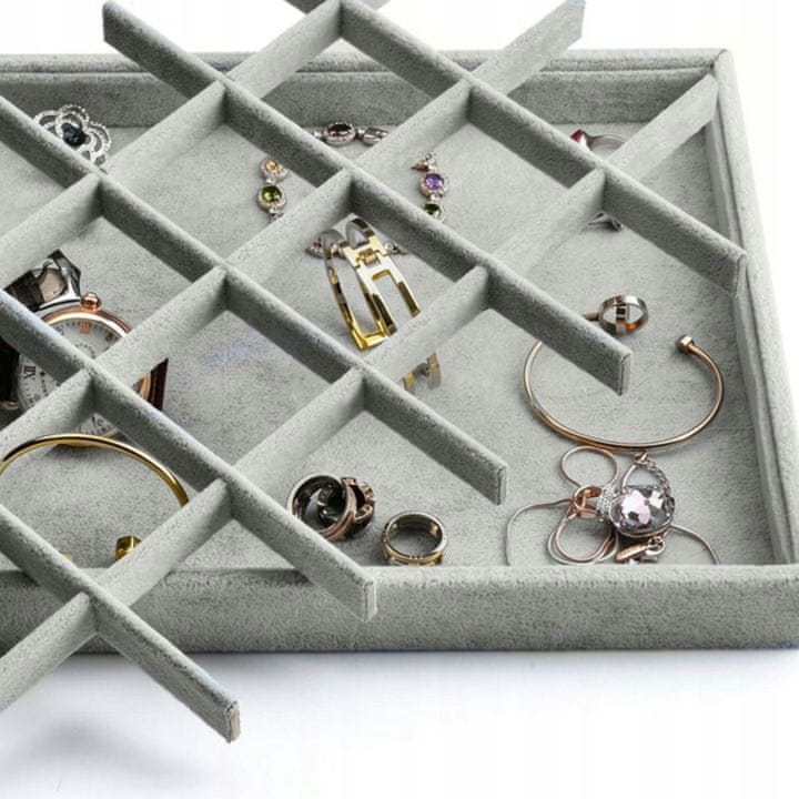 Elegantni sivi pladenj z 24 predelki je popolna rešitev za shranjevanje prstanov, uhanov in drobnega nakita. Mehka podloga ščiti nakit pred praskami, eleganten videz pa dopolni vsak prostor. Idealno za dom ali darilo! Celoten opis