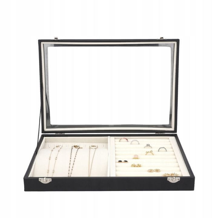✅ Ohrani red in dodaj eleganco svoji zbirki nakita z našo praktično in stilsko škatlo! Zasnovana je za maksimalno funkcionalnost in udobje, z notranjostjo, razdeljeno na dva ločena dela. Ena polovica vključuje valjčke za prstane in uhane, ki preprečujejo njihovo premikanje, druga pa kljukice za verižice in zapestnice, ki ščitijo pred zapletanjem.