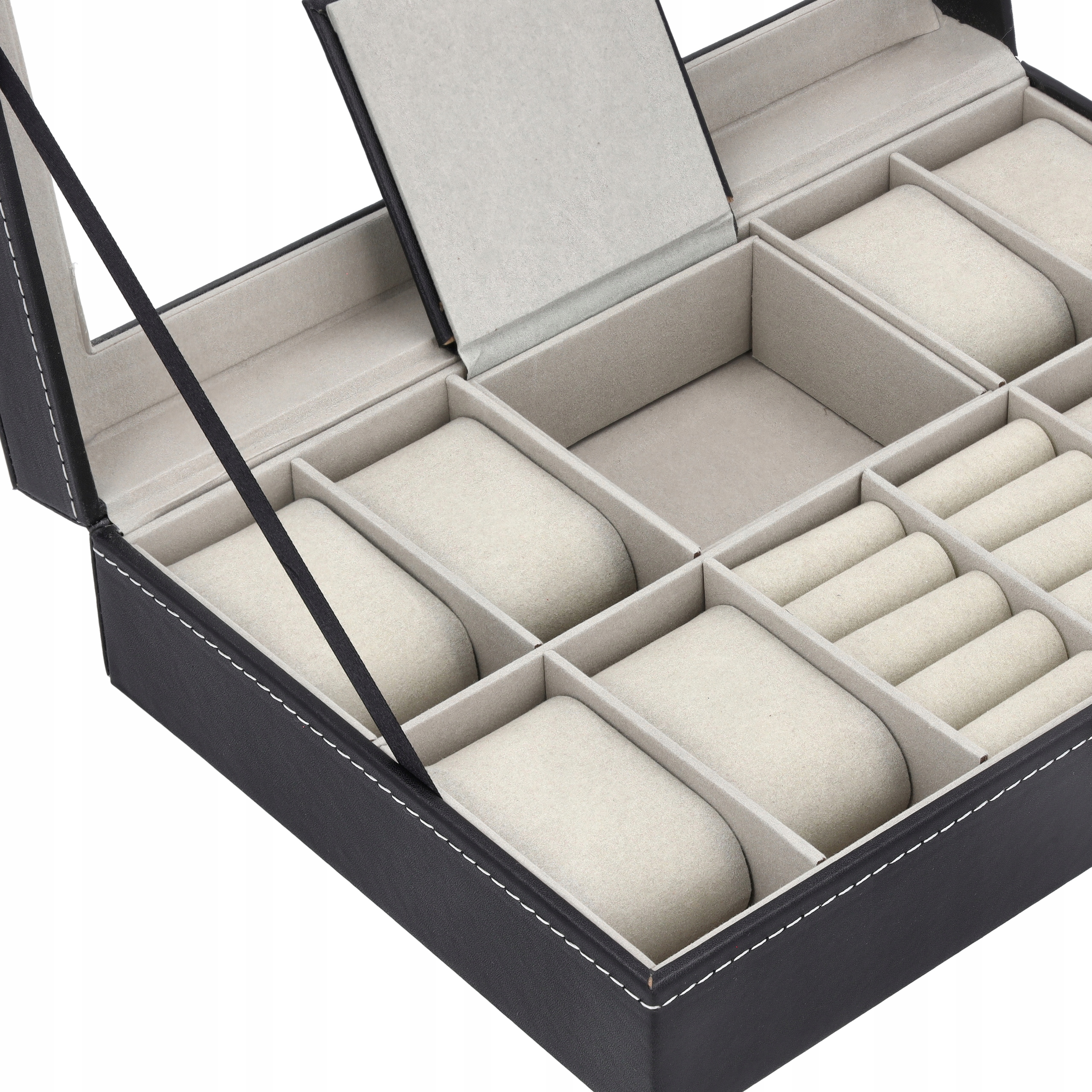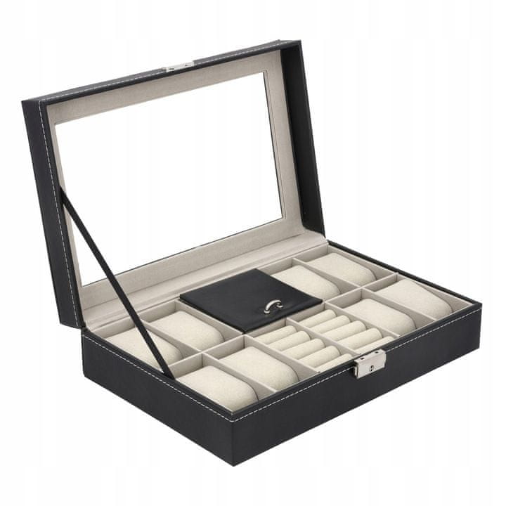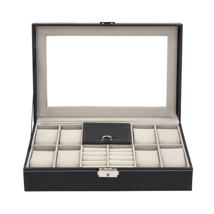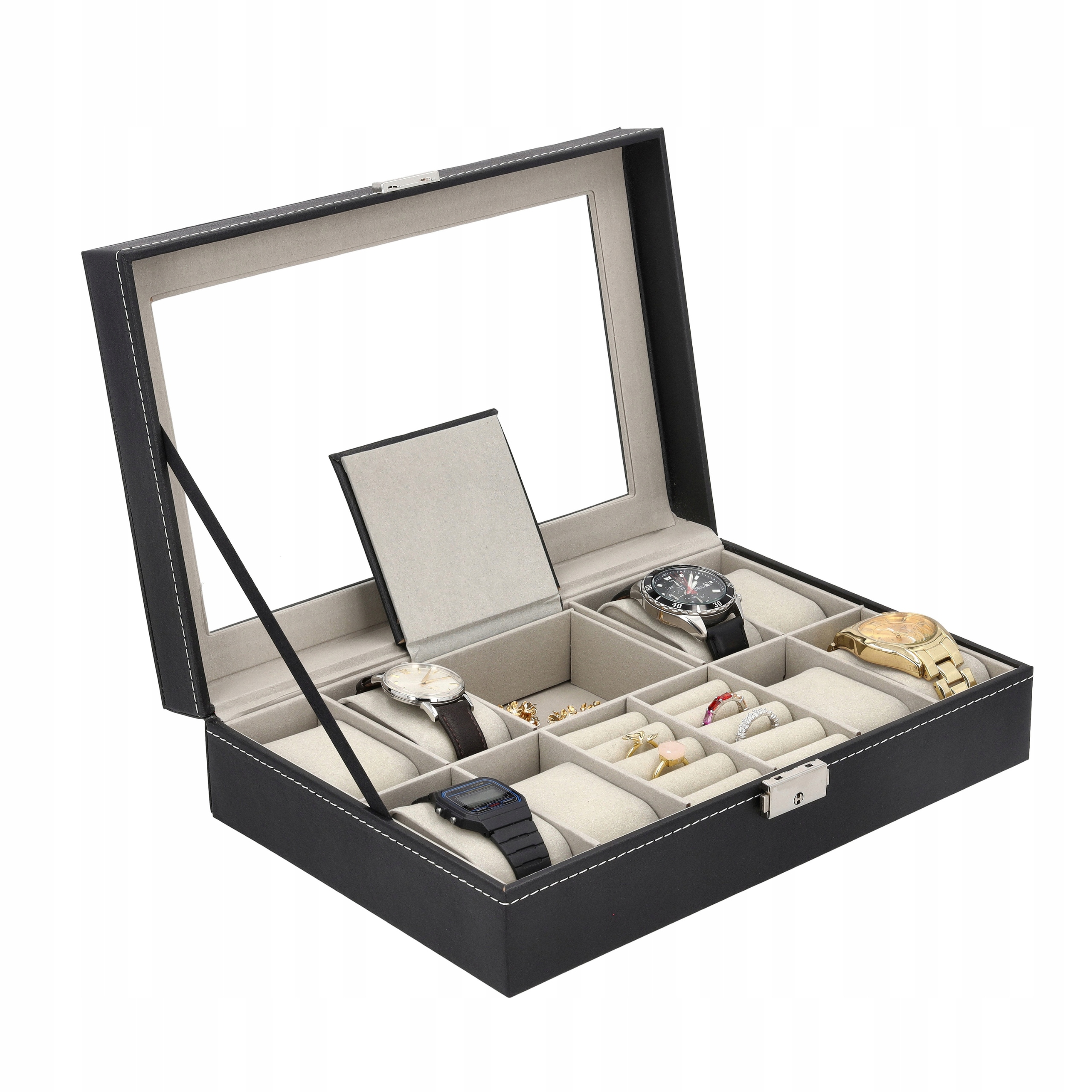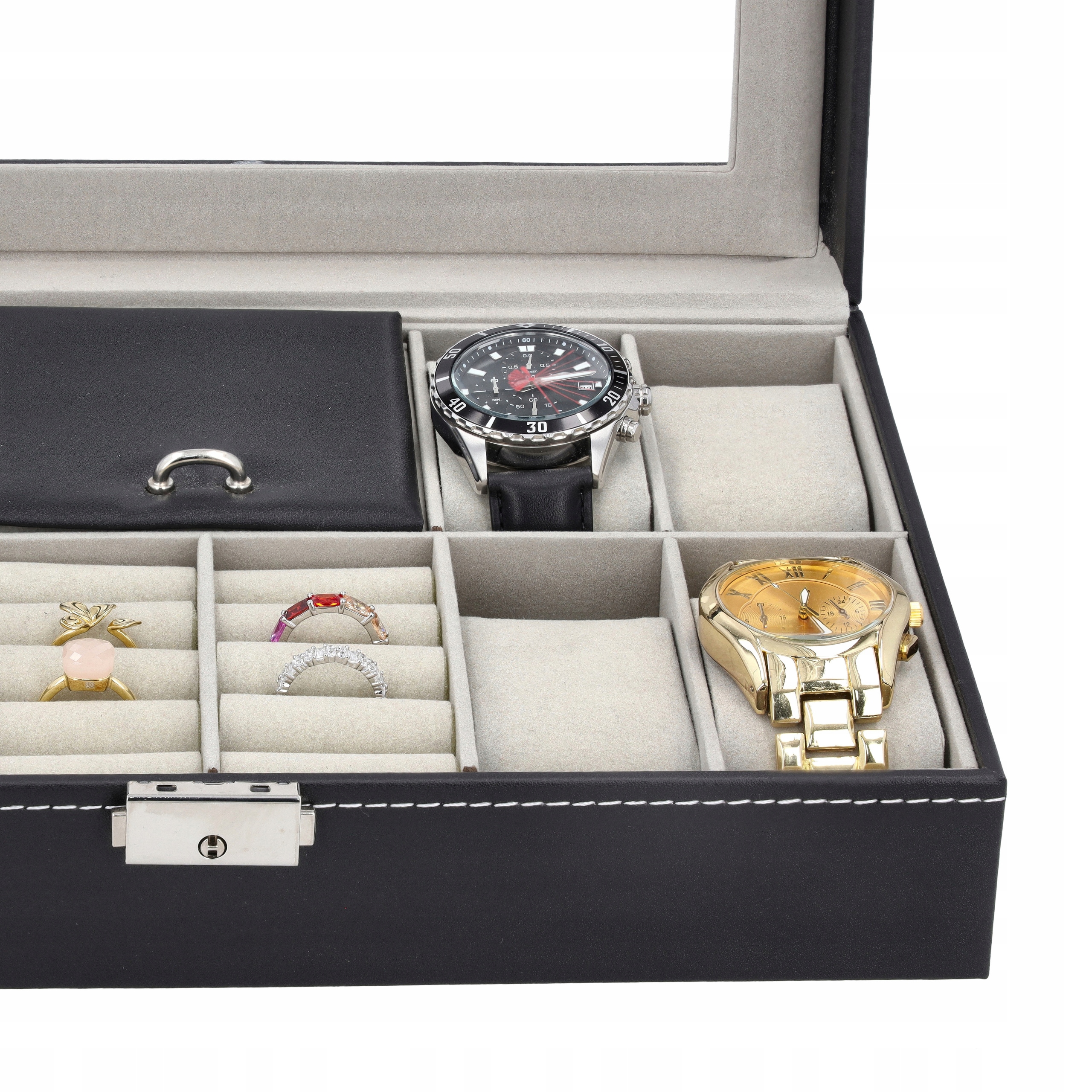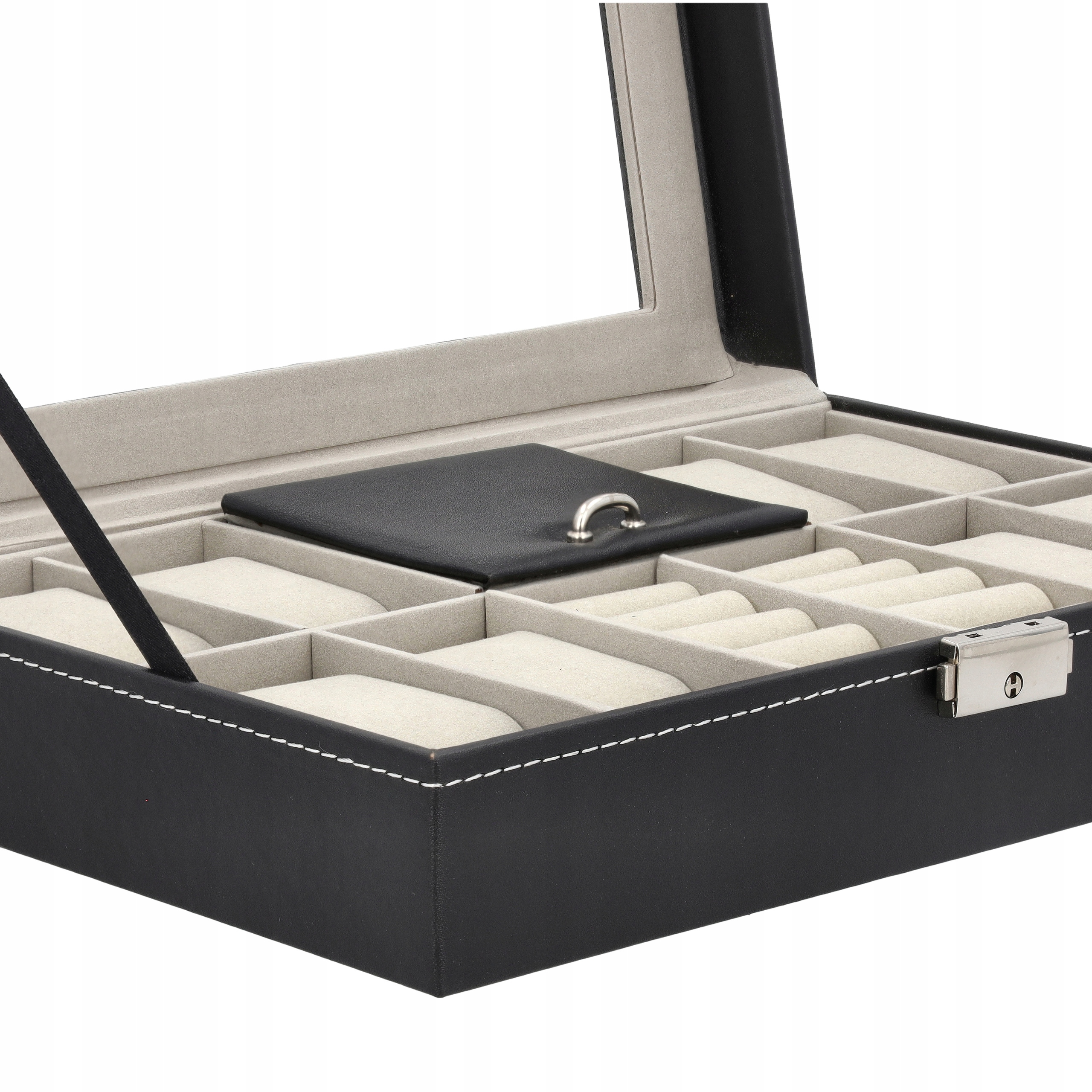 Škatla ima 8 prostorov za ure, 10 valjčkov za prstane in uhane ter se zapira z varnostno kovinsko zaponko. Stekleni pokrov omogoča hiter pogled na vsebino brez potrebe po odpiranju.