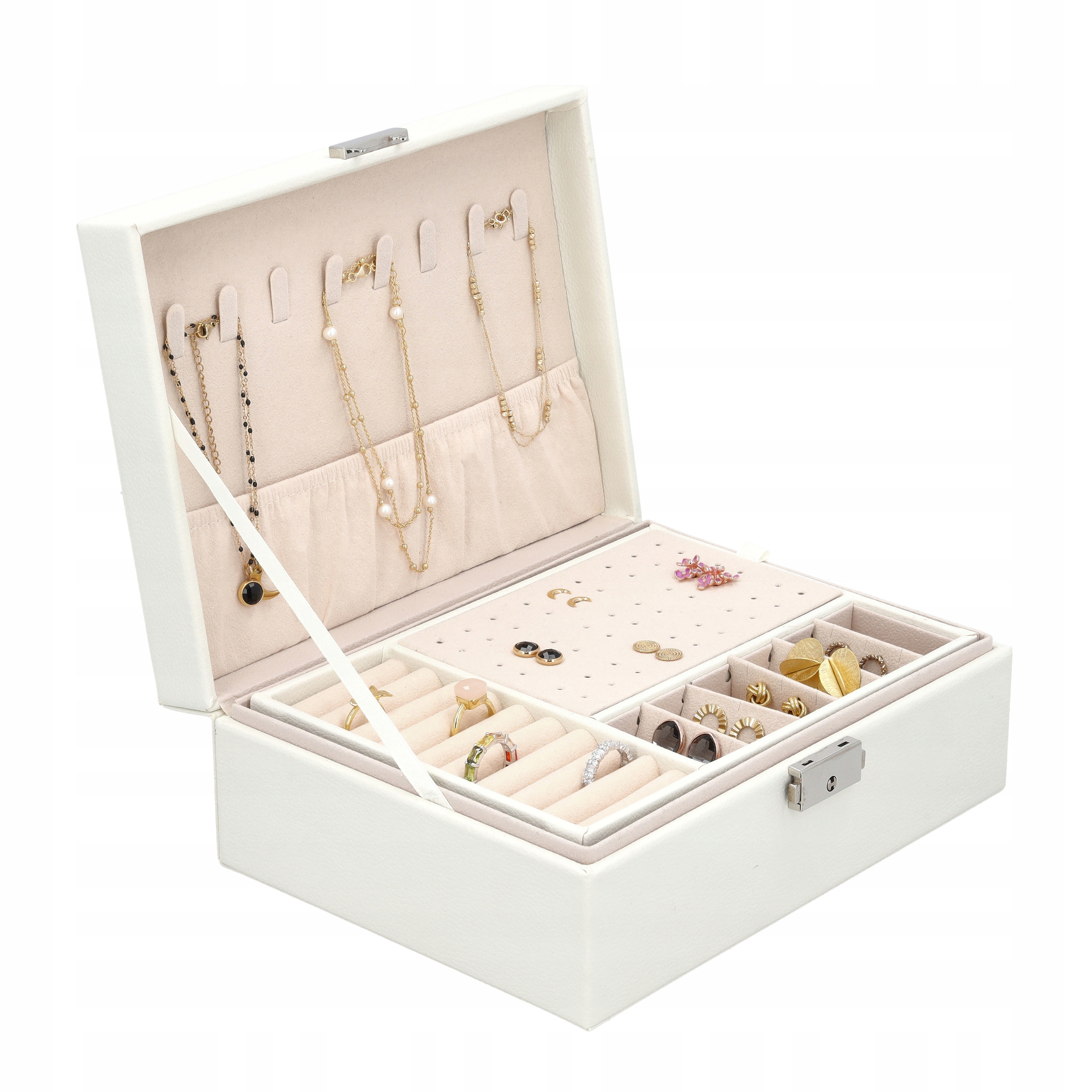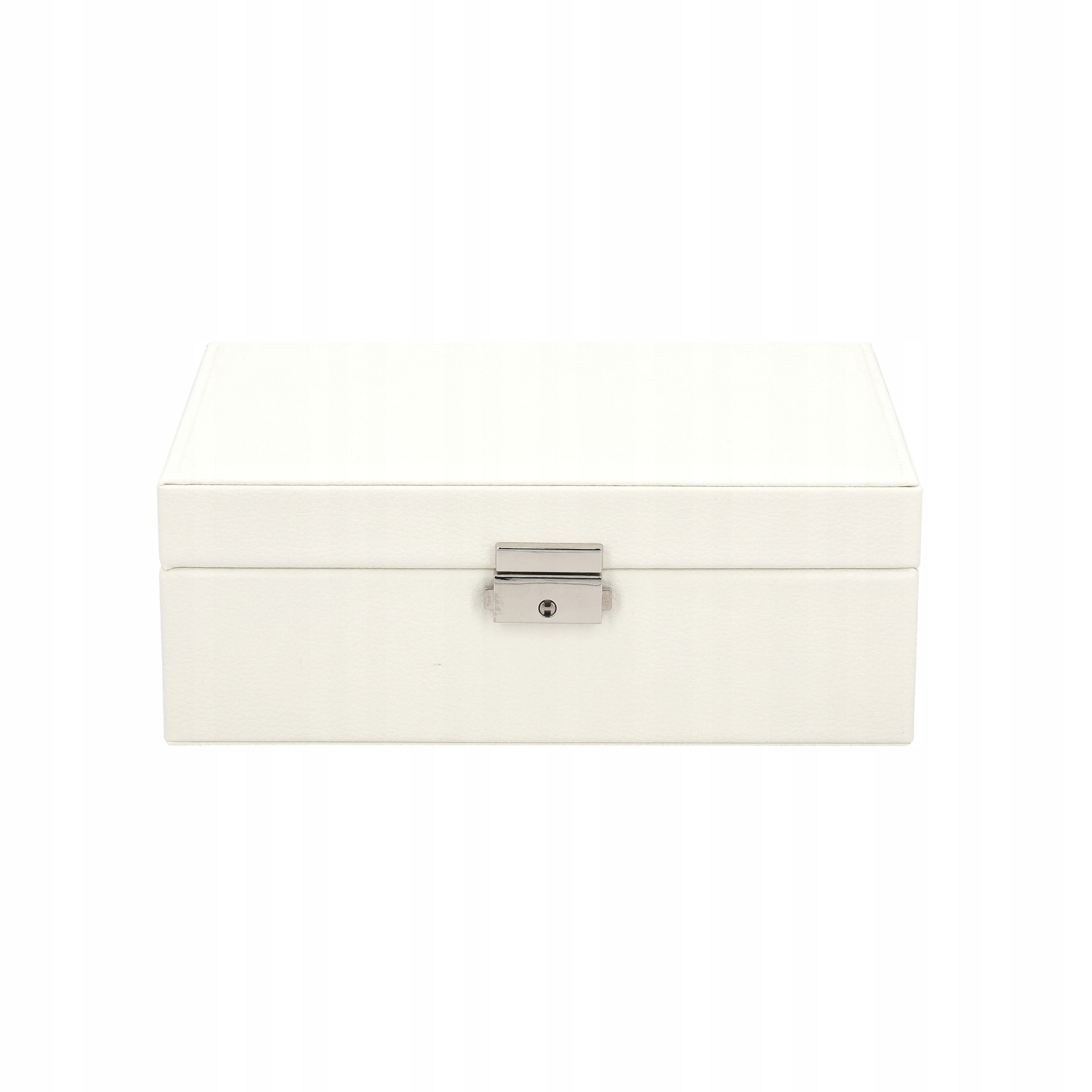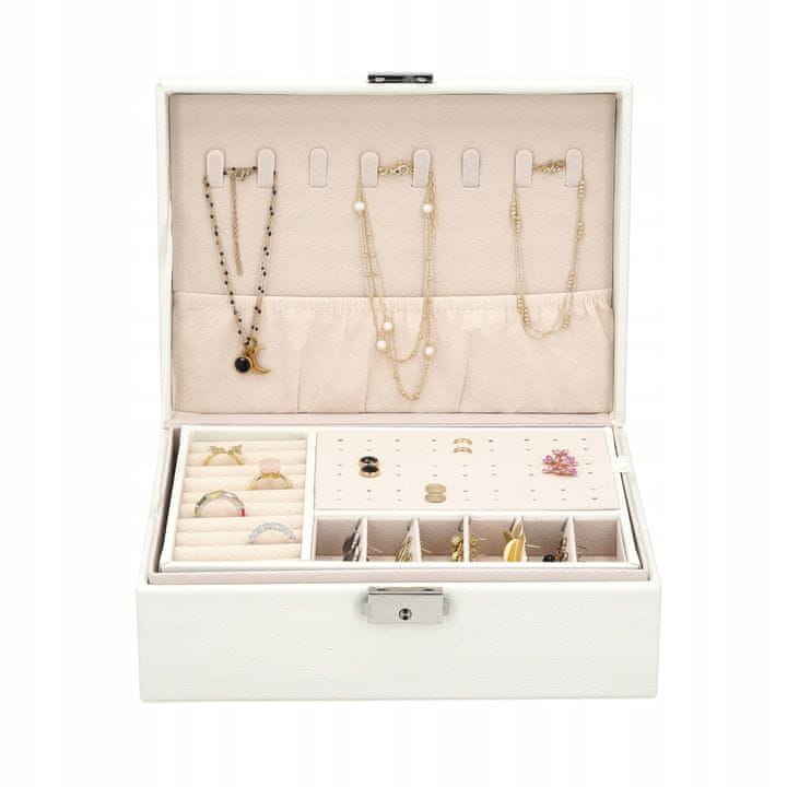 Škatlica se zapira s ključem, kar zagotavlja varno shranjevanje, medtem ko kakovostna izdelava iz umetnega usnja nudi trpežnost in estetski videz za dolga leta. Dodani so tudi kaveljčki za verižice in zapestnice, valjčki za prstane ter prostorne predelne enote.