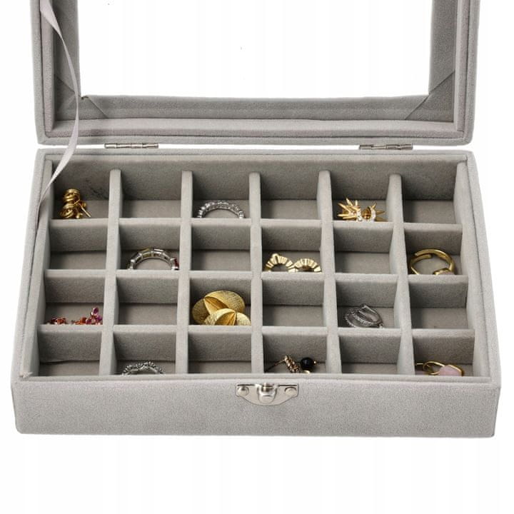 - Praktična razporeditev – Kar 24 ločenih predalčkov, idealnih za shranjevanje prstanov, uhanov in manjših kosov nakita.