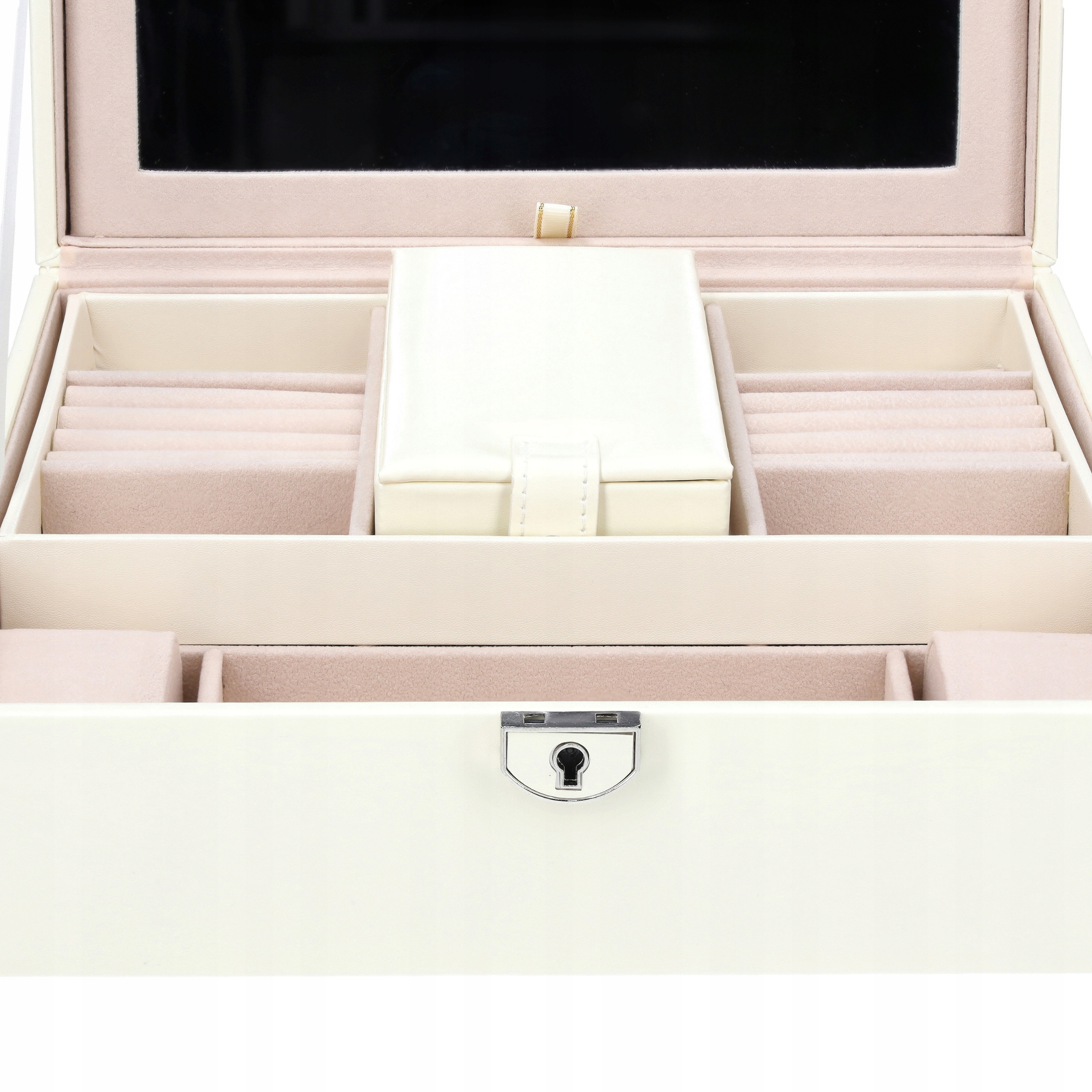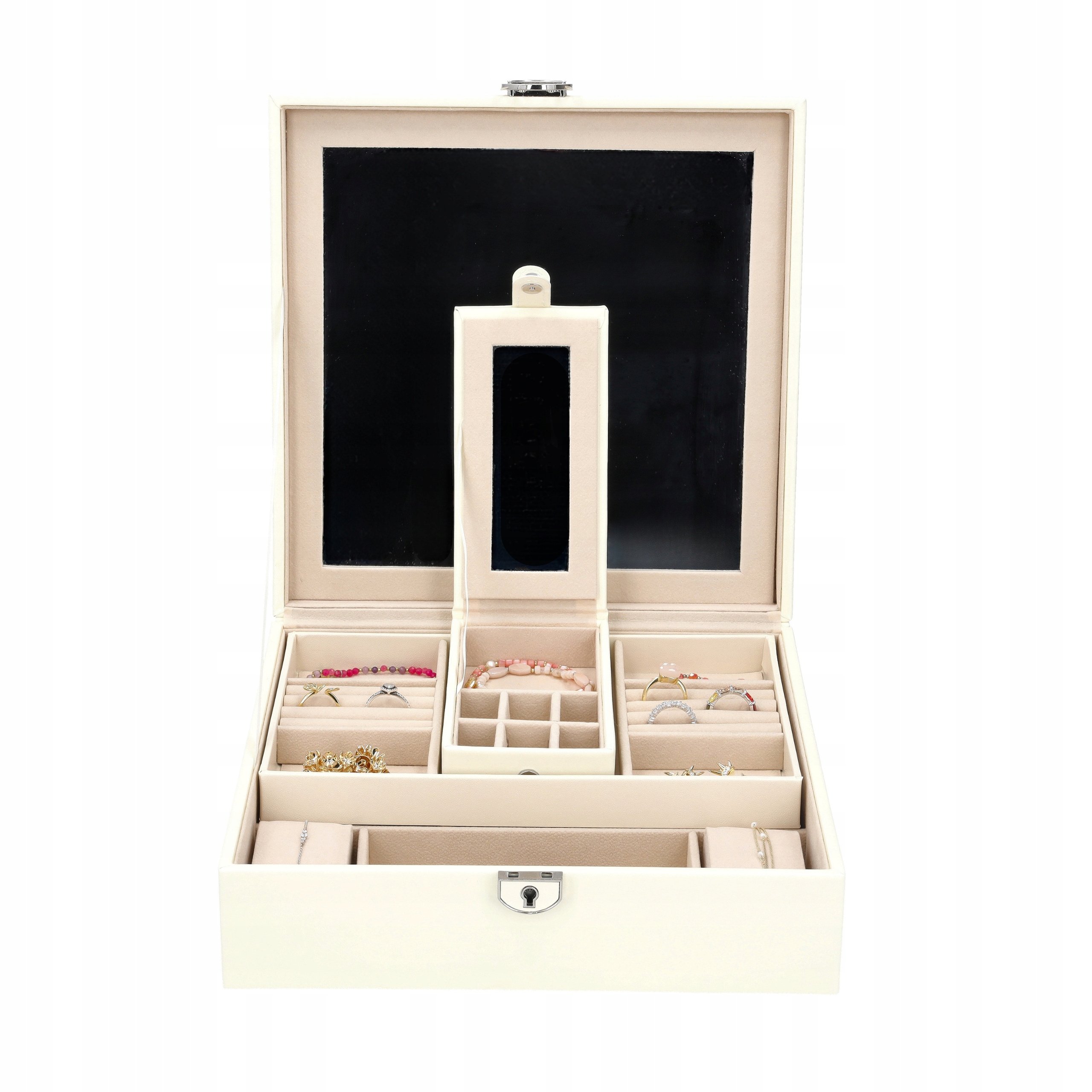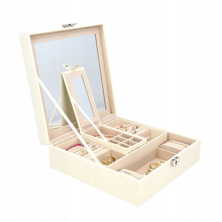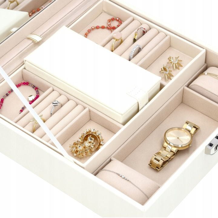 Zahvaljujoč natančno razporejenim predelkom je shranjevanje prstanov, uhanov in zapestnic izjemno preprosto. Mehka notranja podloga varuje občutljive dodatke pred praskami, kompaktna oblika in trdna konstrukcija pa zagotavljata dolgo življenjsko dobo izdelka.
