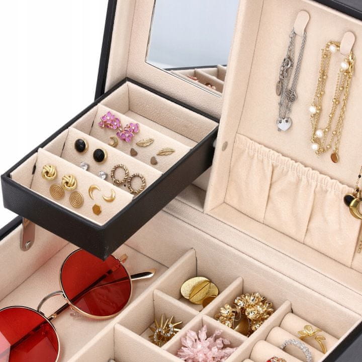 - 💠 Dve ravni shranjevanja – ločena mesta za uhane, prstane, zapestnice in ure