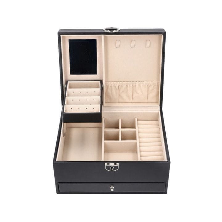 Škatlica omogoča urejeno shranjevanje vseh vrst nakita na dveh nivojih. Kompaktna velikost se prilega vsaki toaletni mizici, elegantna izdelava pa zagotavlja vzdržljivost in brezčasni videz.