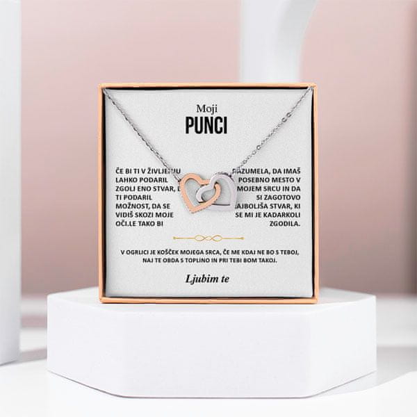 Ekskluzivna kartica s posvetilom: Moji punci Če bi ti v življenju lahko podaril zgolj eno stvar, bi ti podaril možnost, da se vidiš skozi moje oči. Le tako bi razumela, da imaš posebno mesto v mojem srcu in da si zagotovo najboljša stvar, ki se mi je kadarkoli zgodila. V ogrlici je košček mojega srca, če me kdaj ne bo s teboj, naj te obda s toplino in pri tebi bom takoj. Ljubim te