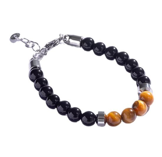 • sestavljena iz črnih steklenih perlic in rjavih perlic tigrovega očesa,