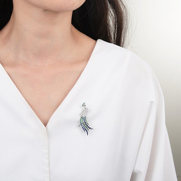 Bleščeča srebrna broška Pav s cirkoni O0000012. Celoten opis