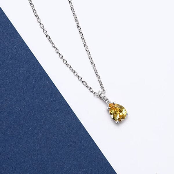 • okrašena z obeskom, ki je obložen s prozornimi cirkoni in rumenim cirkonom,