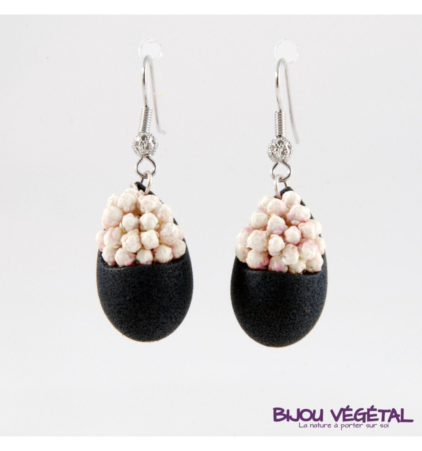 Radis et Capucine Živeti nakit - Solzni uhani črne barve s trajnimi belimi cvetovi