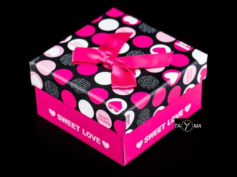 DIMENZIJE dolžina 86 mm širina 86 mm pokrov 89 × 89 mm višina 50 mm Kartonska škatla s srčki v roza, beli in črni barvi z roza trakom z napisom Sweet Love Črna blazina v notranjosti