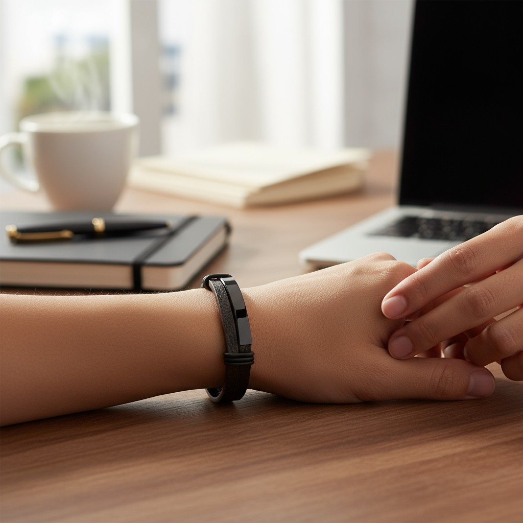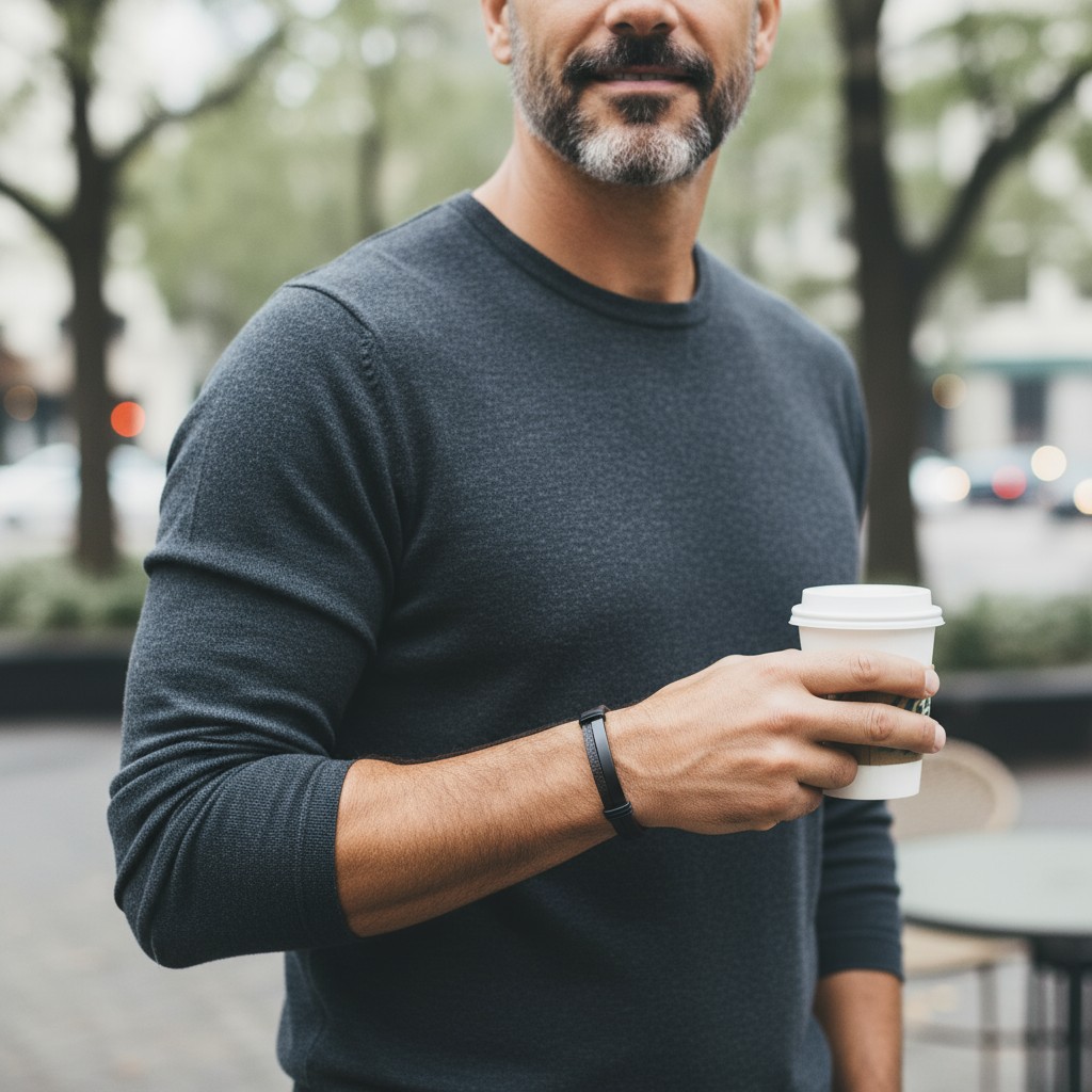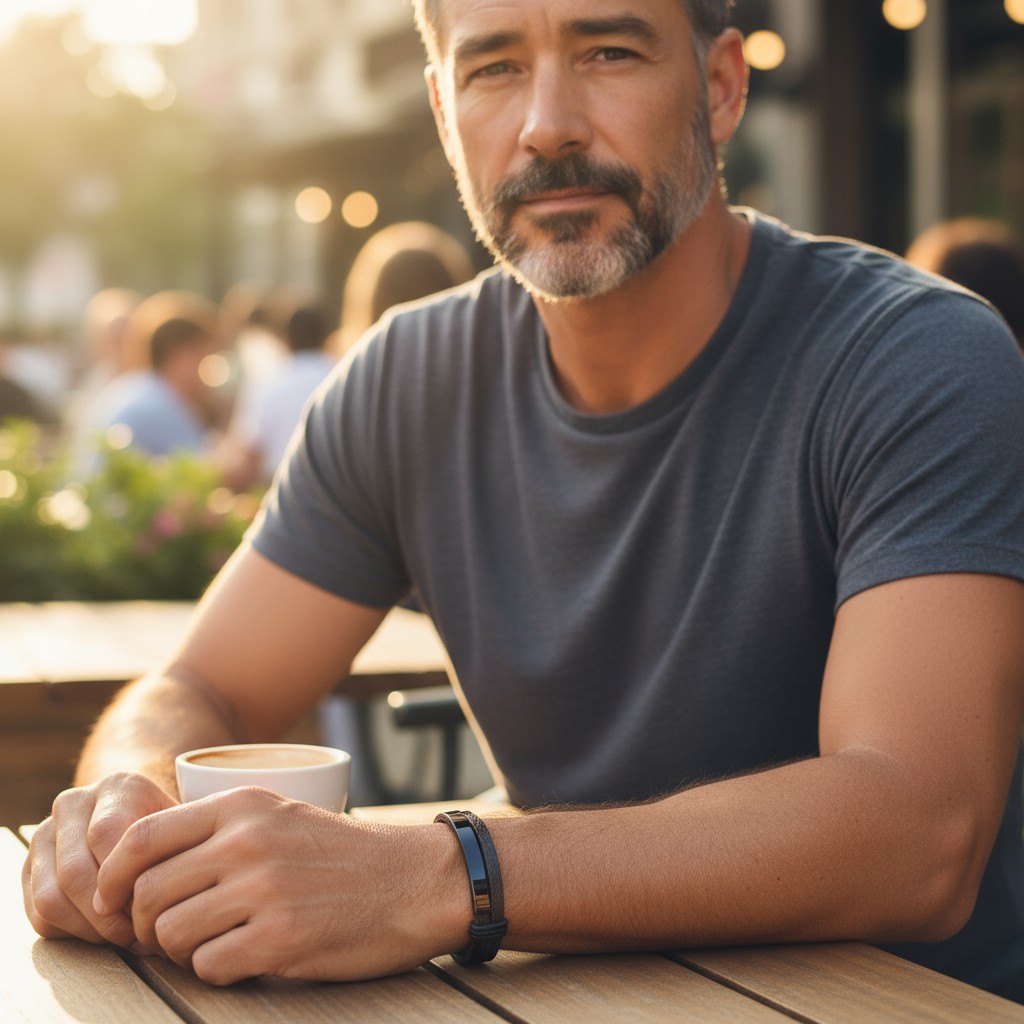 Kombinacija tople rjave barve s črnim kovinskim poudarkom daje zapestnici edinstven značaj. Ta model združuje eleganco in sodoben slog, primeren tako za vsakdanje kot za bolj formalno oblačenje.