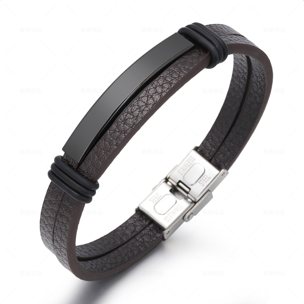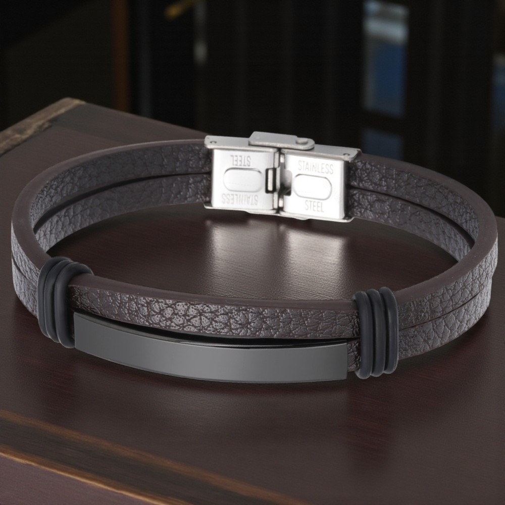 Moška rjava usnjena zapestnica, črno jeklo, 21 cm Celoten opis