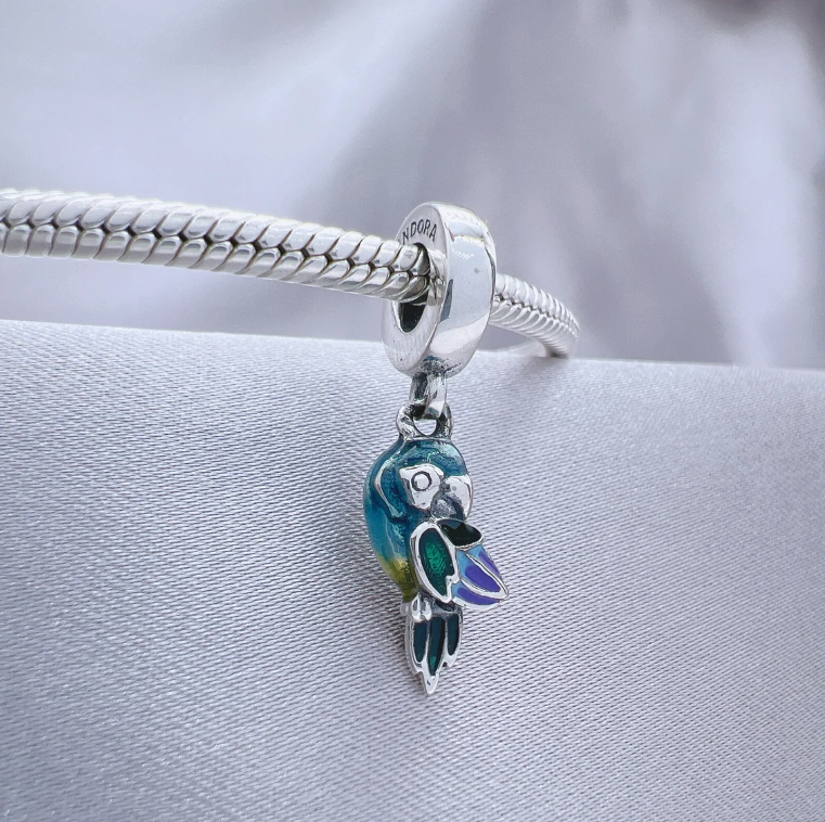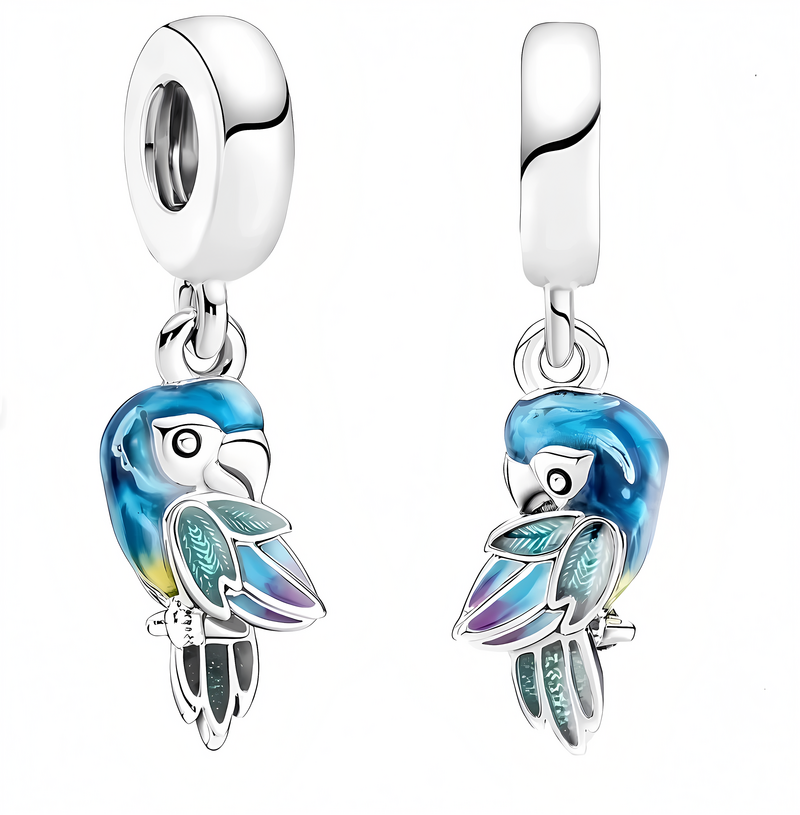 Osupljiv posrebren obesek, ki prikazuje papigo v odtenkih modre in zelene.