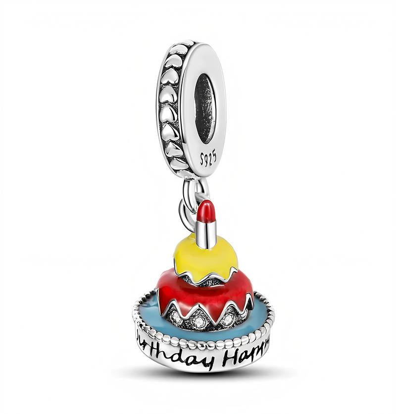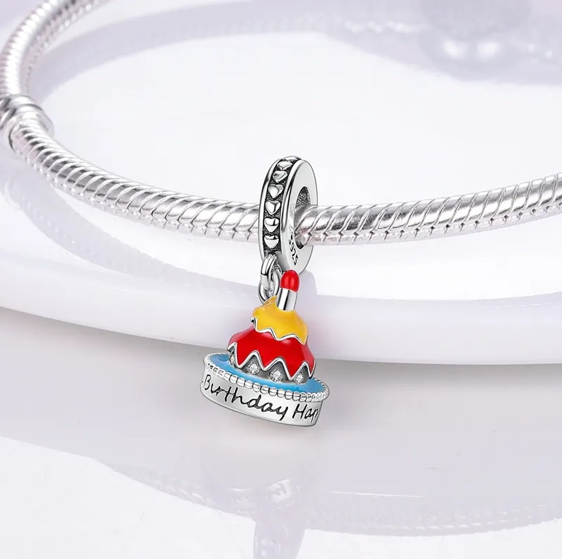 Edinstven posrebren obesek v obliki pisane rojstnodnevne torte. Na dnu obeska je vgraviran napis „Happy Birthday“.