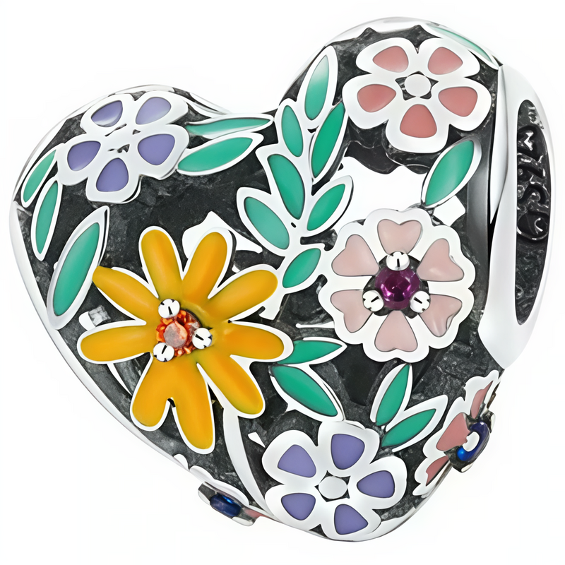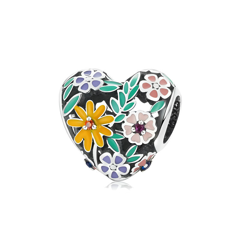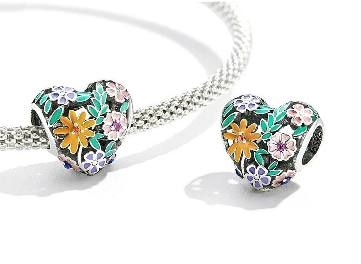 Čudovit obesek, izdelan iz posrebrenega bakra v obliki ažurnega srca z barvitimi cvetovi in listi.