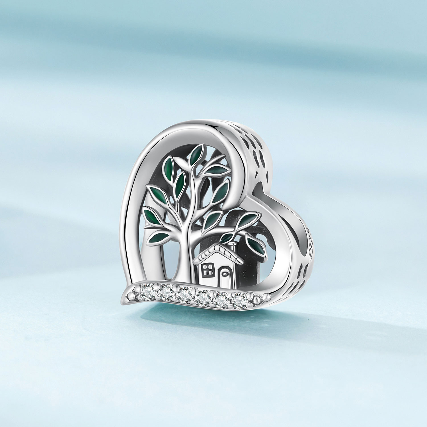 Edinstven obesek, izdelan iz iz srebra 925, v obliki srce z drevesom in majhno hišico spodaj.