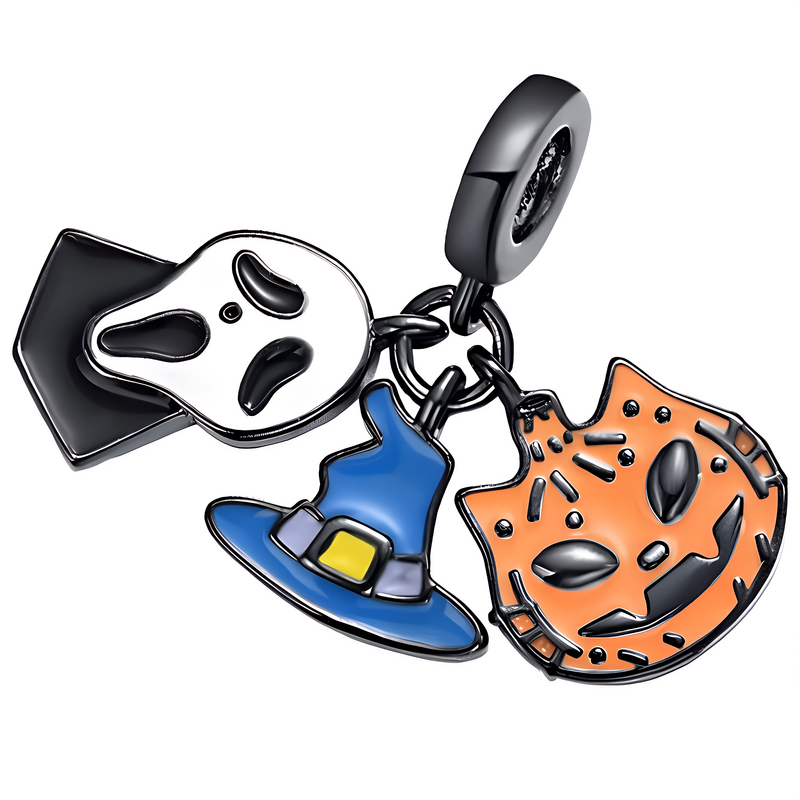 Edinstven posrebren obesek, ki prikazuje bučo, čarovniški klobuk in masko iz priljubljenega grozljivke „Krik“. Popoln za noč čarovnic.
