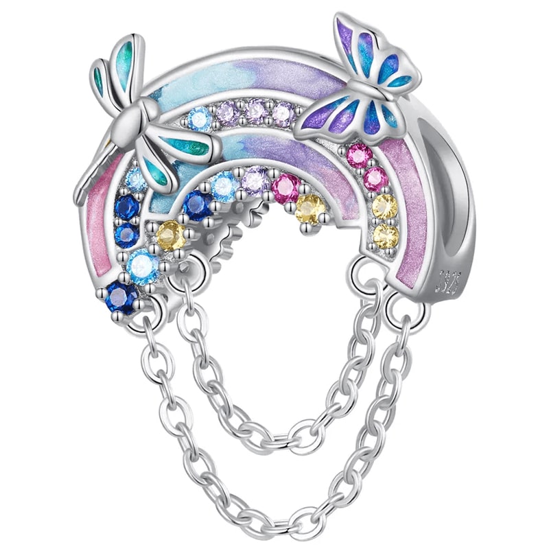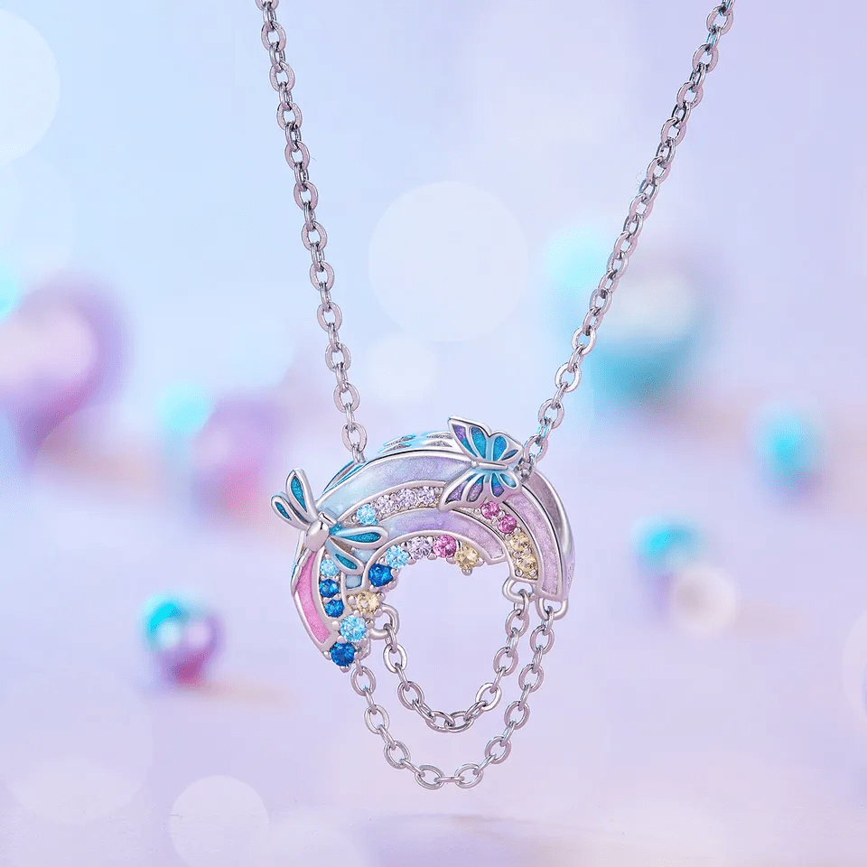 Edinstven obesek, izdelan iz srebra 925 . Obesek prikazuje mavrico, okrašeno z barvitimi kubičnimi cirkoni najvišje kakovosti s kačjim pastirjem in metuljem.
