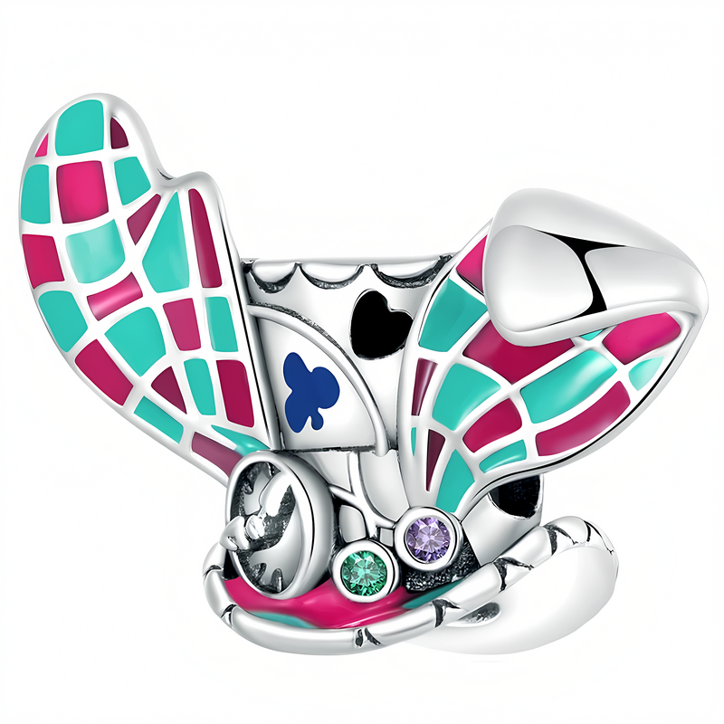 Edinstven, barvit obesek, izdelan iz srebra 925. Obesek prikazuje nenavaden klobuk Klobučarja, enega od likov iz Alice v čudežni deželi.