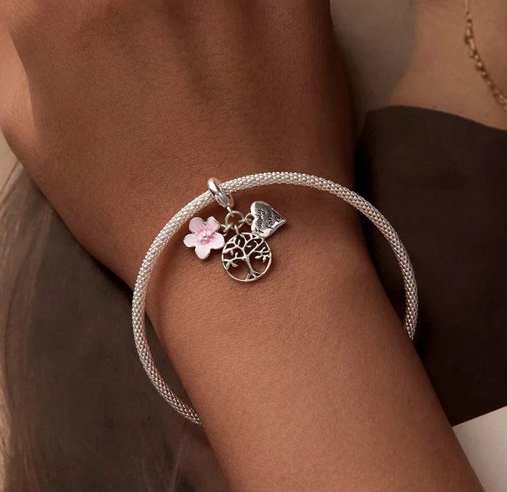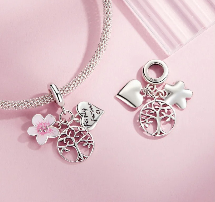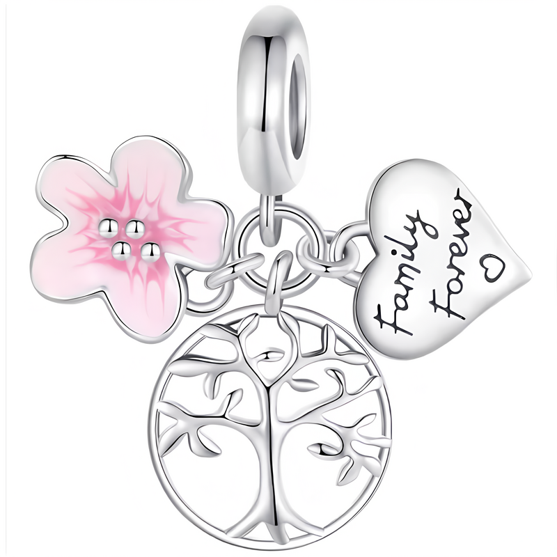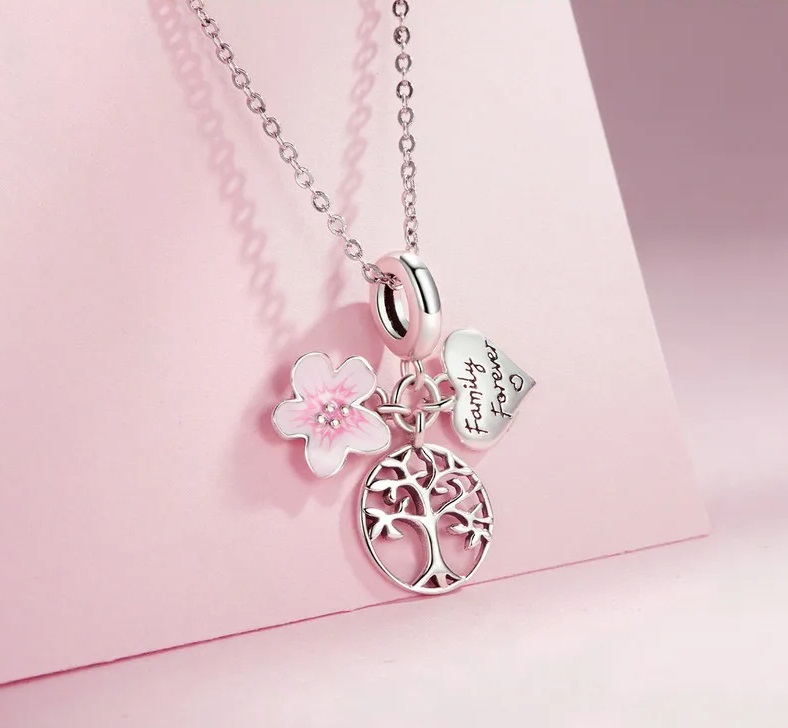 Unikaten obesek, izdelan iz iz srebra 925 , sestavljen iz treh elementov – drevesa življenja, srca z napisom „Družina za vedno“ in rožnatega češnjevega cveta.