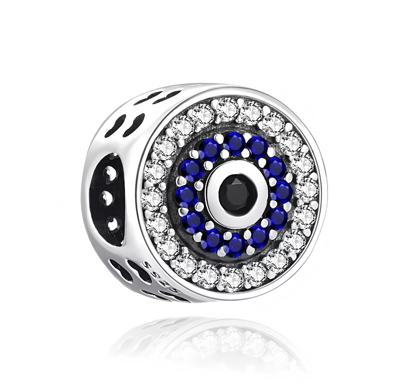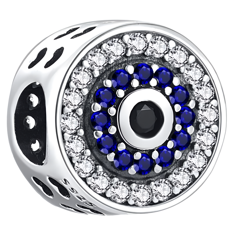 Čudovit okrogel obesek iz posrebrenega bakra s simbolom uroka, okrašenim z večbarvnimi cirkoni.