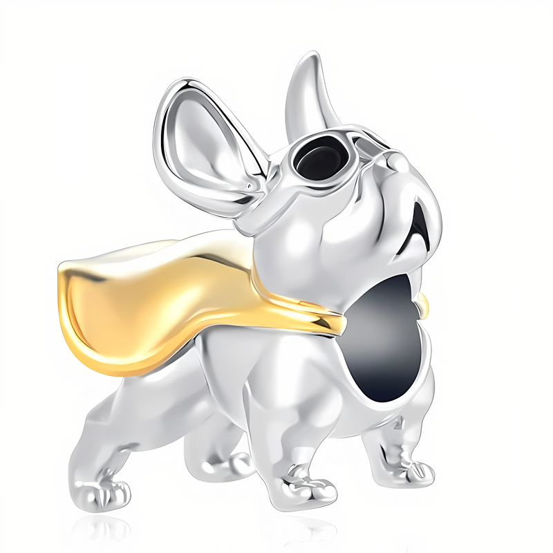 Unikaten posrebren obesek v obliki ljubkega buldoga s sončnimi očali in zlatim ogrinjalo.