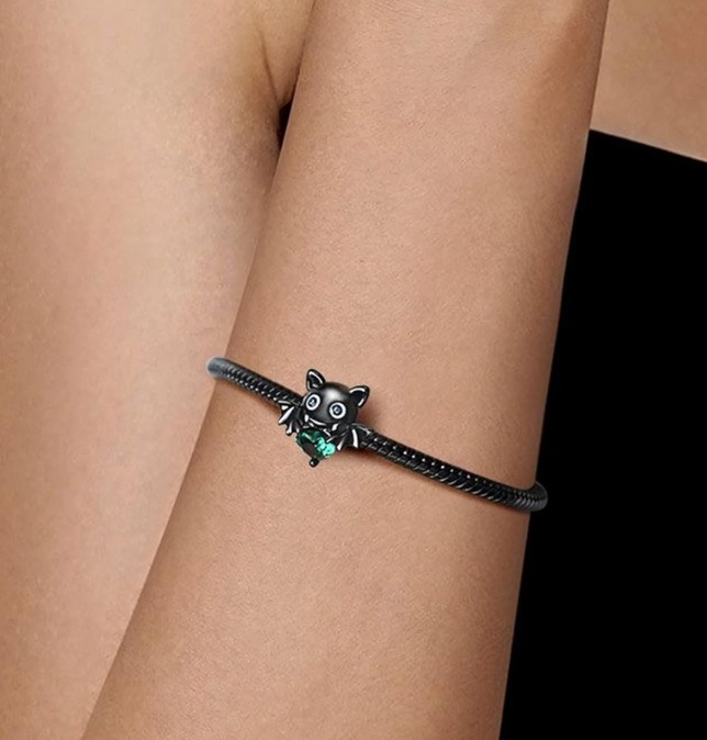 Edinstven, posrebren obesek s črnim netopirjem, ki drži veliko zeleno srce, izdelano iz najkakovostnejšega kubičnih cirkonija.