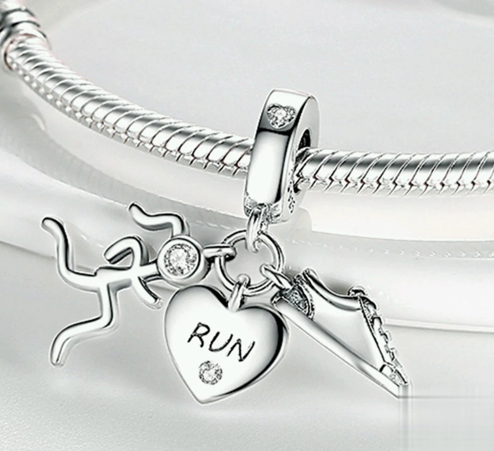 Čudovit, trojno posrebren obesek, okrašen s srcem z vgraviranim napisom „RUN“ in belim kubičnim cirkonom, športnim čevljem in figuro dekleta, ki teče, z velikim belim cirkonom, vdelanim na glava.