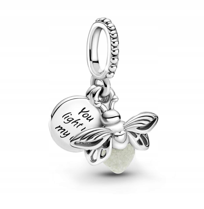 Čudovit, posrebren obesek s fluorescentnim kresničkom, okrašen z vgraviranim napisom „You light up my life“.