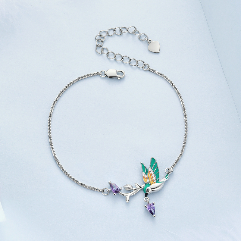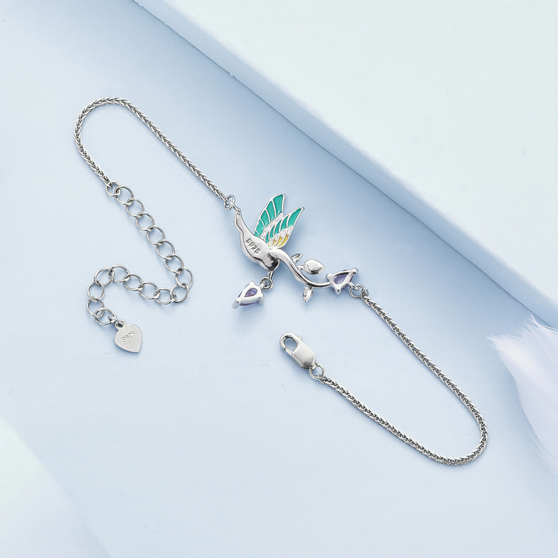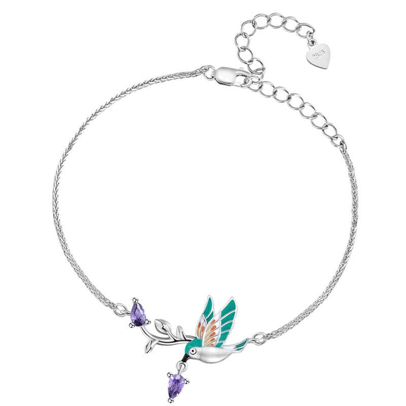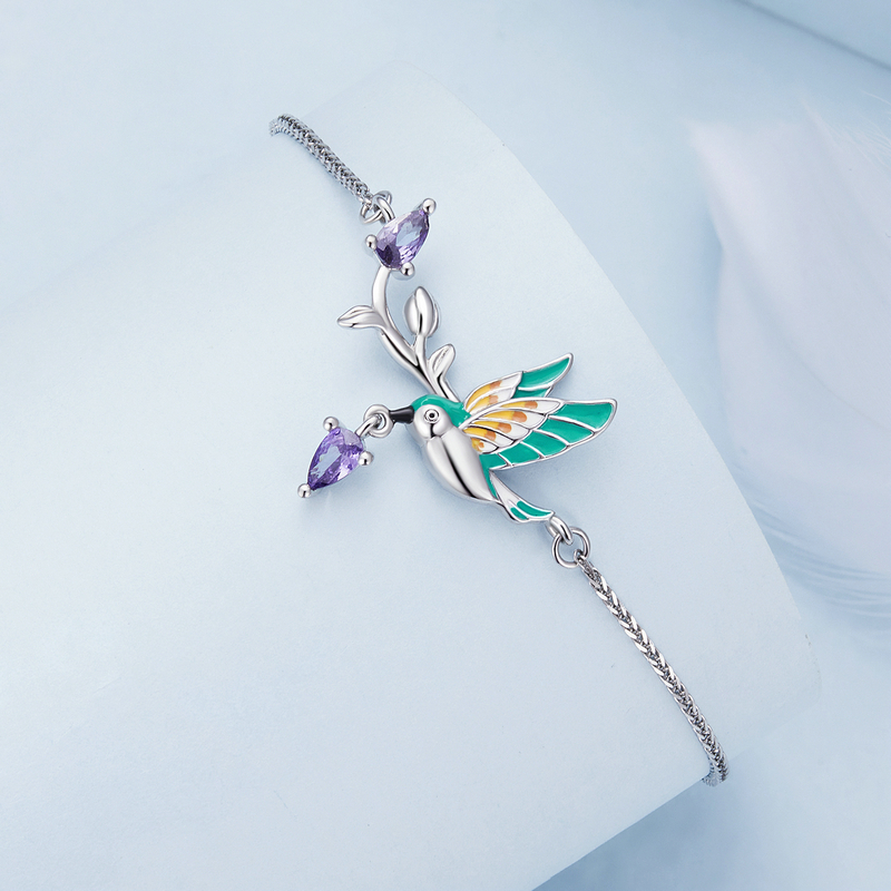Čudovita, nežna zapestnica iz srebra 925 okrašena s pisanim kolibrijem in vejico z vijoličnimi cvetovi kubičnih cirkonov.