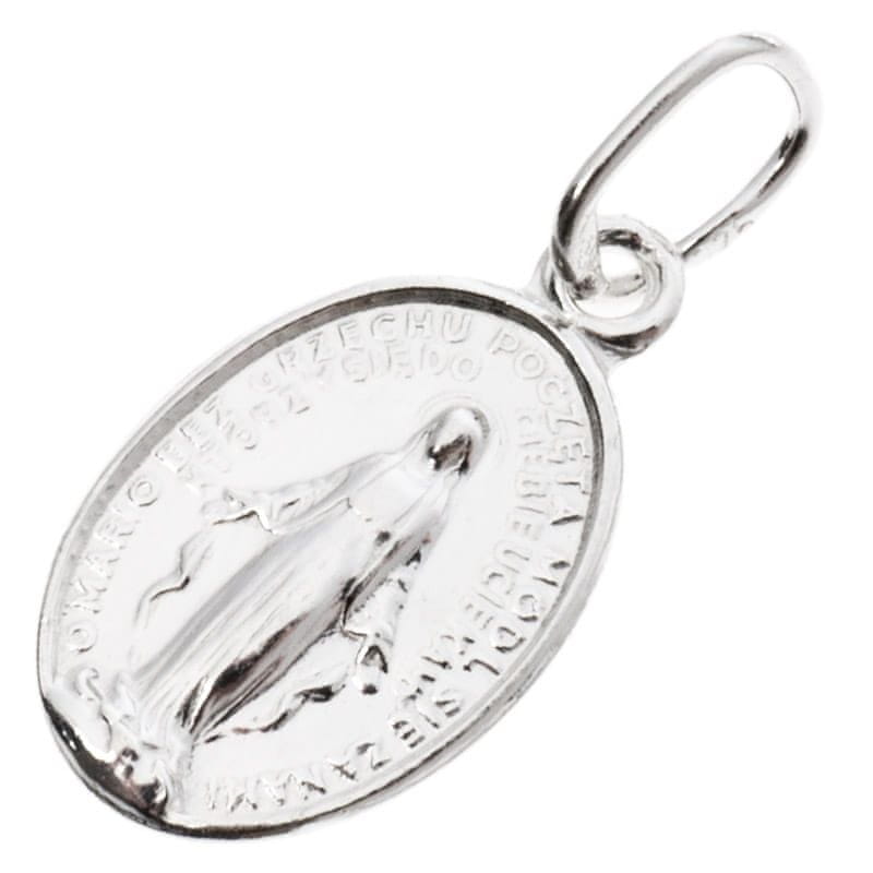 Srebrni medaljon s podoboMarije Brezmadežne, narejenoiz srebra 925.Medaljon ovalne oblike z napisom »O Marija brez greha spočeta, prosi za nas, ki se k tebi zatekamo«.    Popoln kot spomin na krst ali prvo sveto obhajilo.