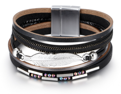 shumee Usnjena zapestnica s paščki in peresnim ovojem, črna