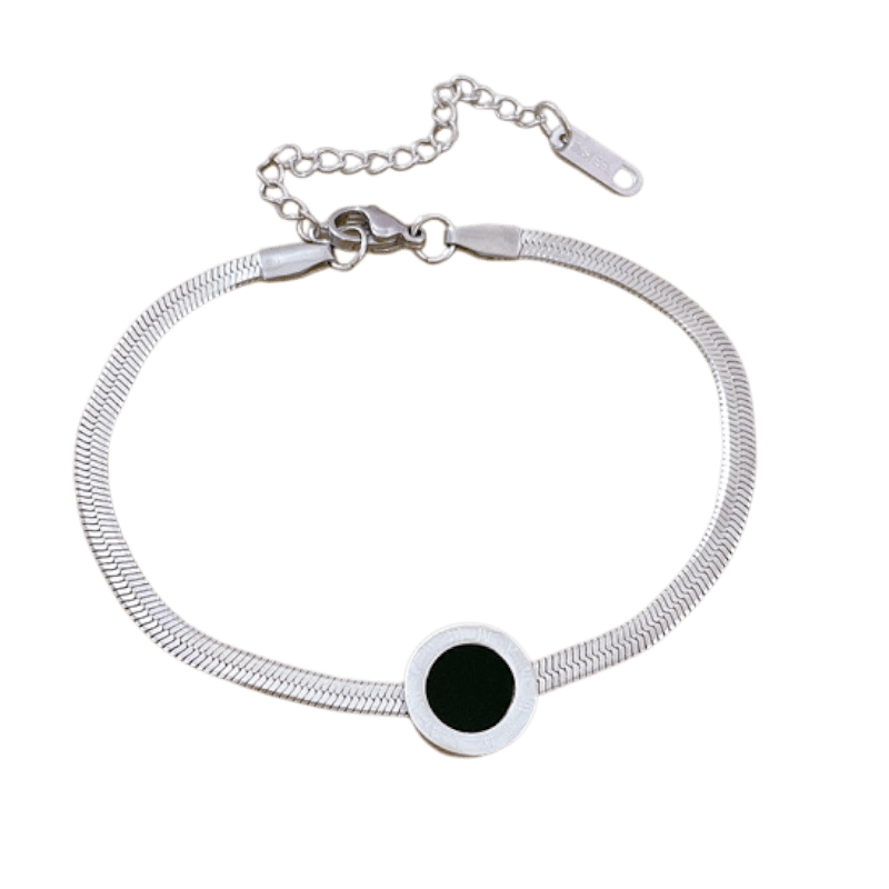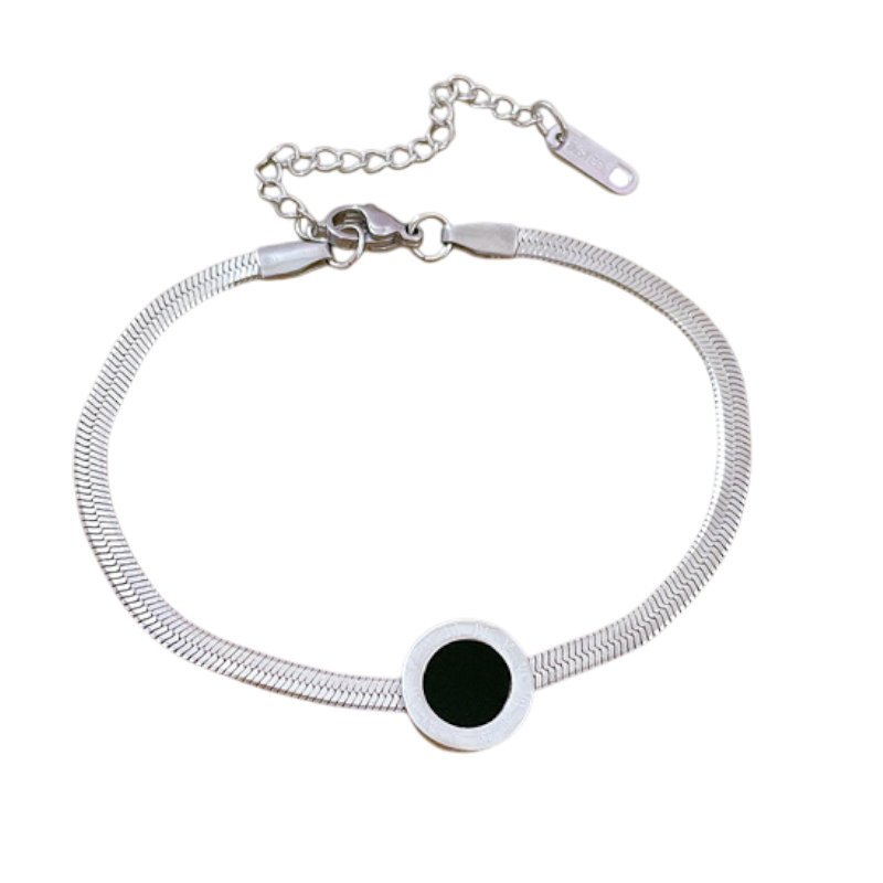 Subtilna, a impresivna ženska zapestnicasrebrni barvi, okrašena z okroglim črnim očesom v osrednjem delu. Izdelano iz visokokakovostne kovinske zlitine, odporne proti obrabi in bledenju barv.