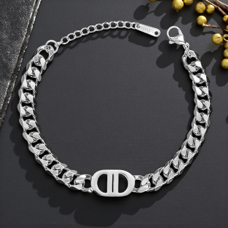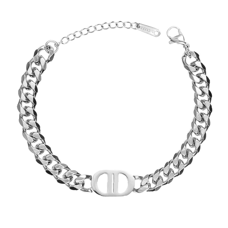Moderna in elegantna ženska zapestnica iz visokokakovostnega nerjavečega jekla, odpornega proti rjavenju, potemnitvi in izgubi sijaja. Klasično verižico iz členov dopolnjuje eleganten dekorativni element v osrednjem delu, ki zapestnici daje moden, razkošen značaj.