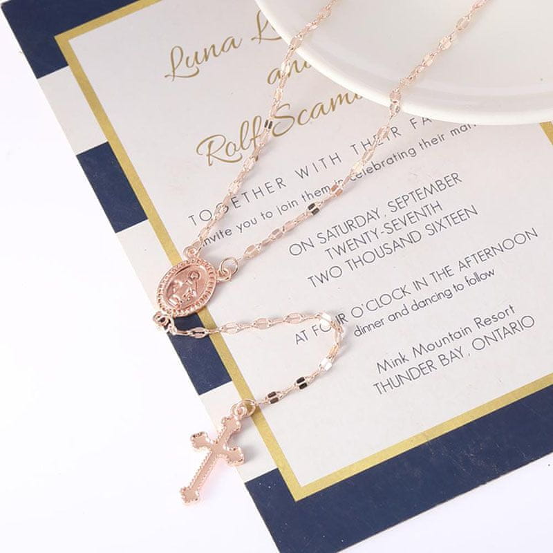 Čudovita vintage verižica je izdelana v rožno-zlatih tonih. Krasita jo motiv Usmiljene in enostaven obesek s križem. Brezčasni duhovni simbol dopolnjuje 41 cm dolga verižica z zaponko.