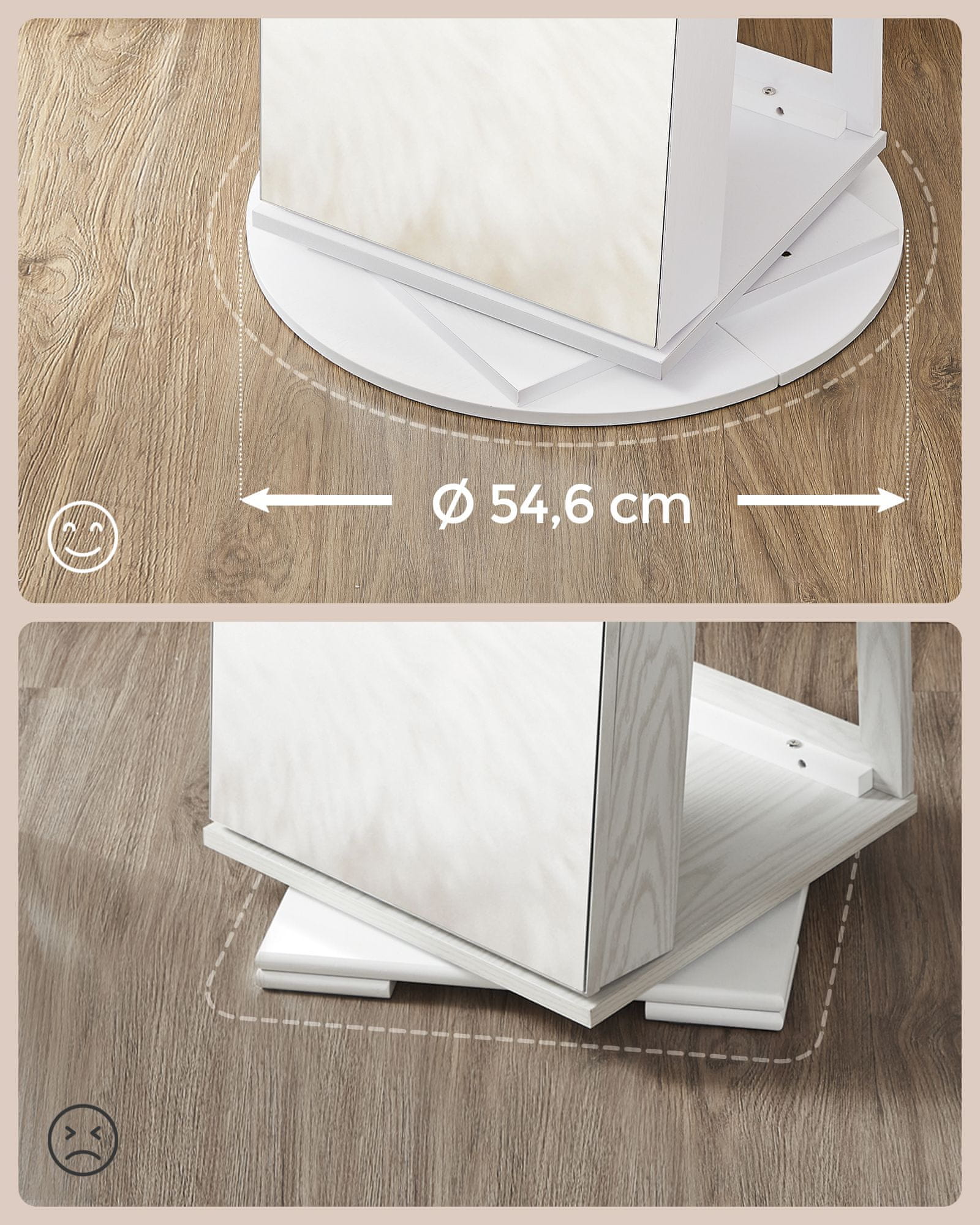Ta omarica za nakit je zasnovana za organizirano in enostavno dostopno shranjevanje vaših dodatkov hkrati pa prostoru doda pridih elegance. S celopostavnim ogledalom in številnimi možnostmi shranjevanja omogoča preprosto izbiranje in usklajevanje nakita ter oblačil. Omarica vključuje tudi vgrajeno osvetlitev in mini toaletno mizico za priročno ličenje. Material: MDF (vlaknena plošča srednje gostote) žametna tkanina polistiren (PS) steklo Dimenzije: 55×55×162cm Barva: bela Dolžina (cm): 55 Višina (cm): 162 Globina / širina (cm): 267 Material (podrobno): steklo – ogledalno steklo Material (podrobno): les plošča – plošče in lesni derivati Z ali brez ogledala: ogledalo