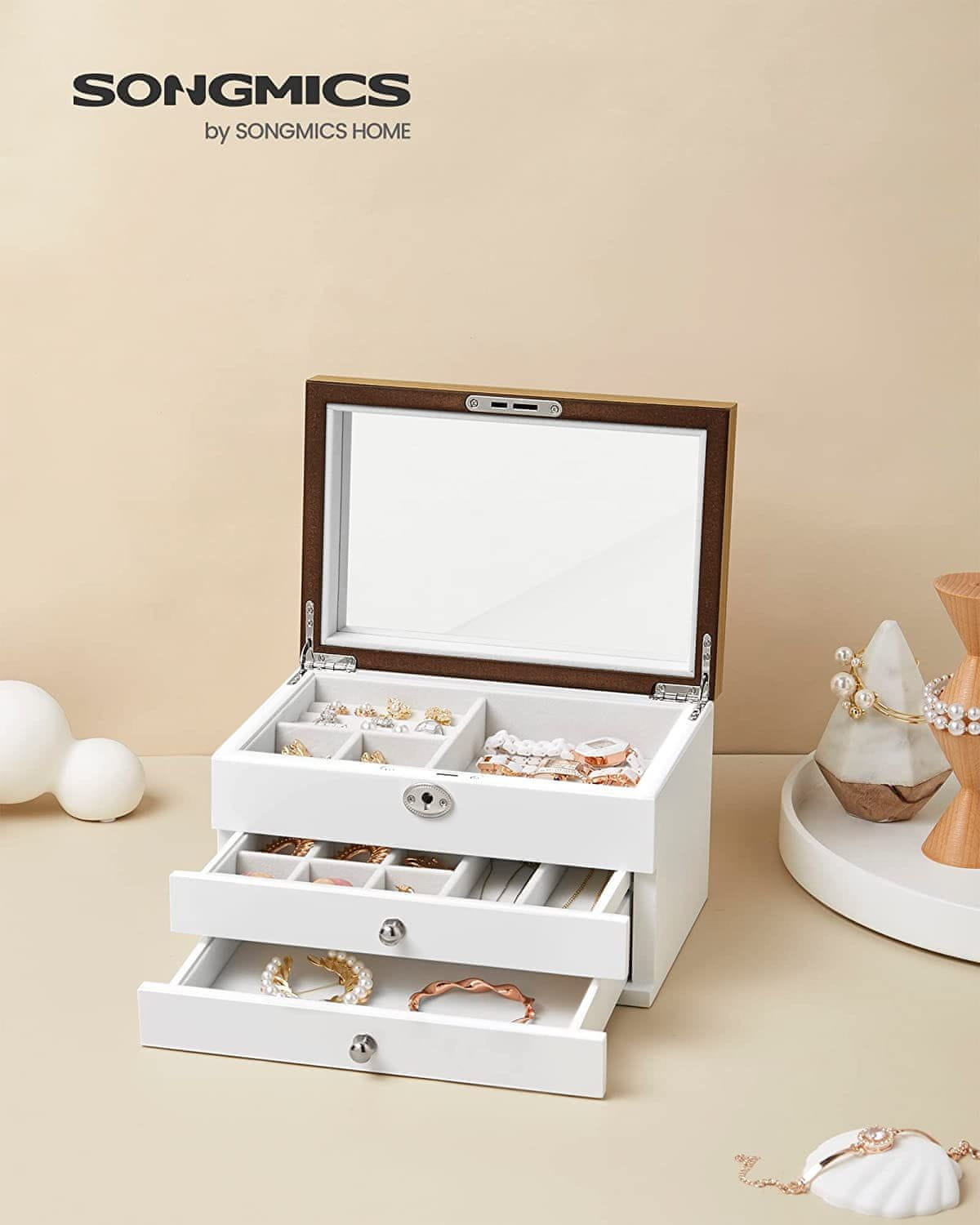 Songmics Škatla za nakit, 3-nadstropna z ogledalom, 25x18x14,5 cm, bela