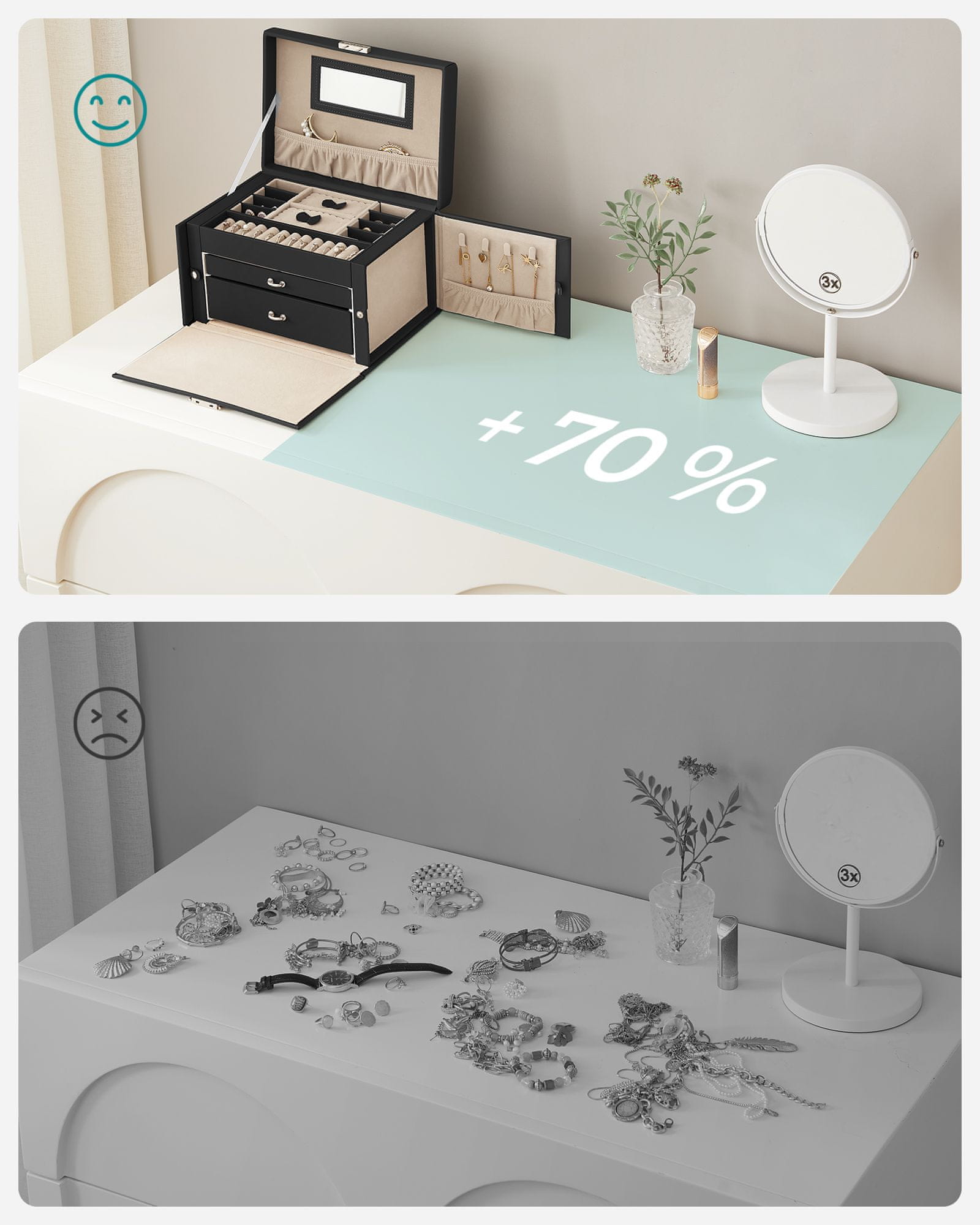 Ta elegantna škatla za nakit je zasnovana za organizirano in varno shranjevanje vaših dragocenih dodatkov. Z več predali, predali in posebnim prostorom za ogrlice ponuja praktično rešitev za urejeno shranjevanje uhanov, zapestnic, prstanov in drugih kosov nakita. Njena kompaktna zasnova vključuje ogledalo in mini etui, zato je idealna tako za domačo uporabo kot za potovanja.