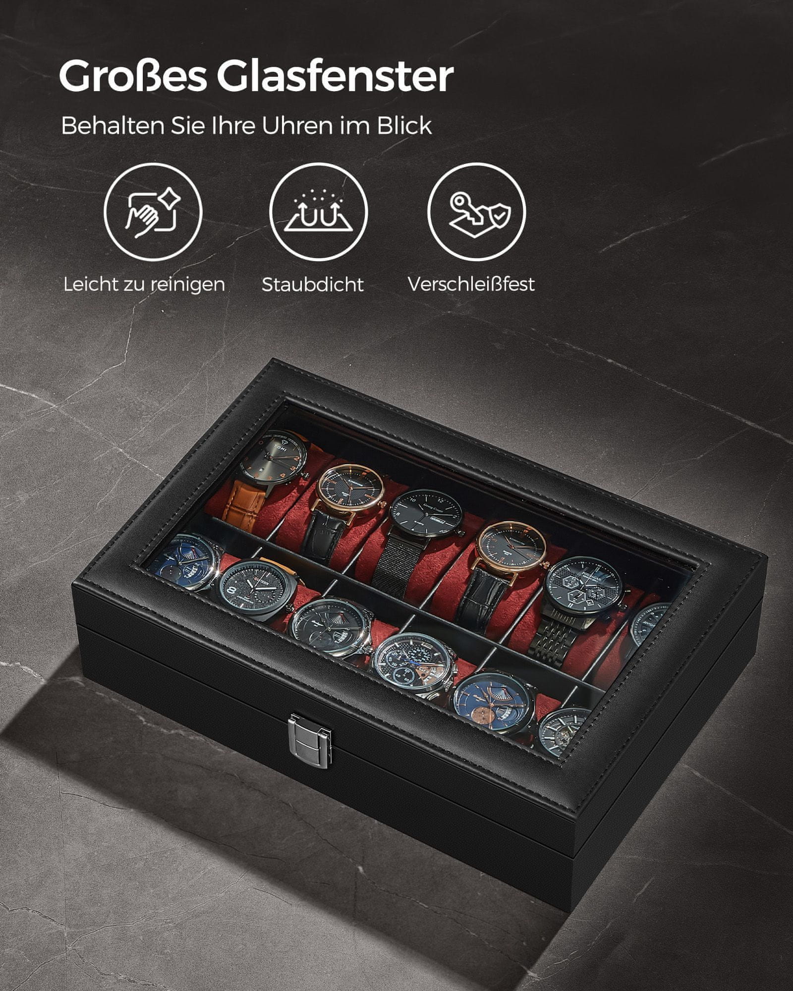 Ta elegantna škatla za ure ponuja stilsko in praktično rešitev za organizacijo in razstavljanje vaše zbirke ur. Oblikovana z več predelki in steklenim pokrovom omogoča da so vaše ure zaščitene in enostavno dostopne. Odstranljive blazinice za ure in varna kovinska zaponka jo naredijo idealno tako za shranjevanje kot predstavitev.