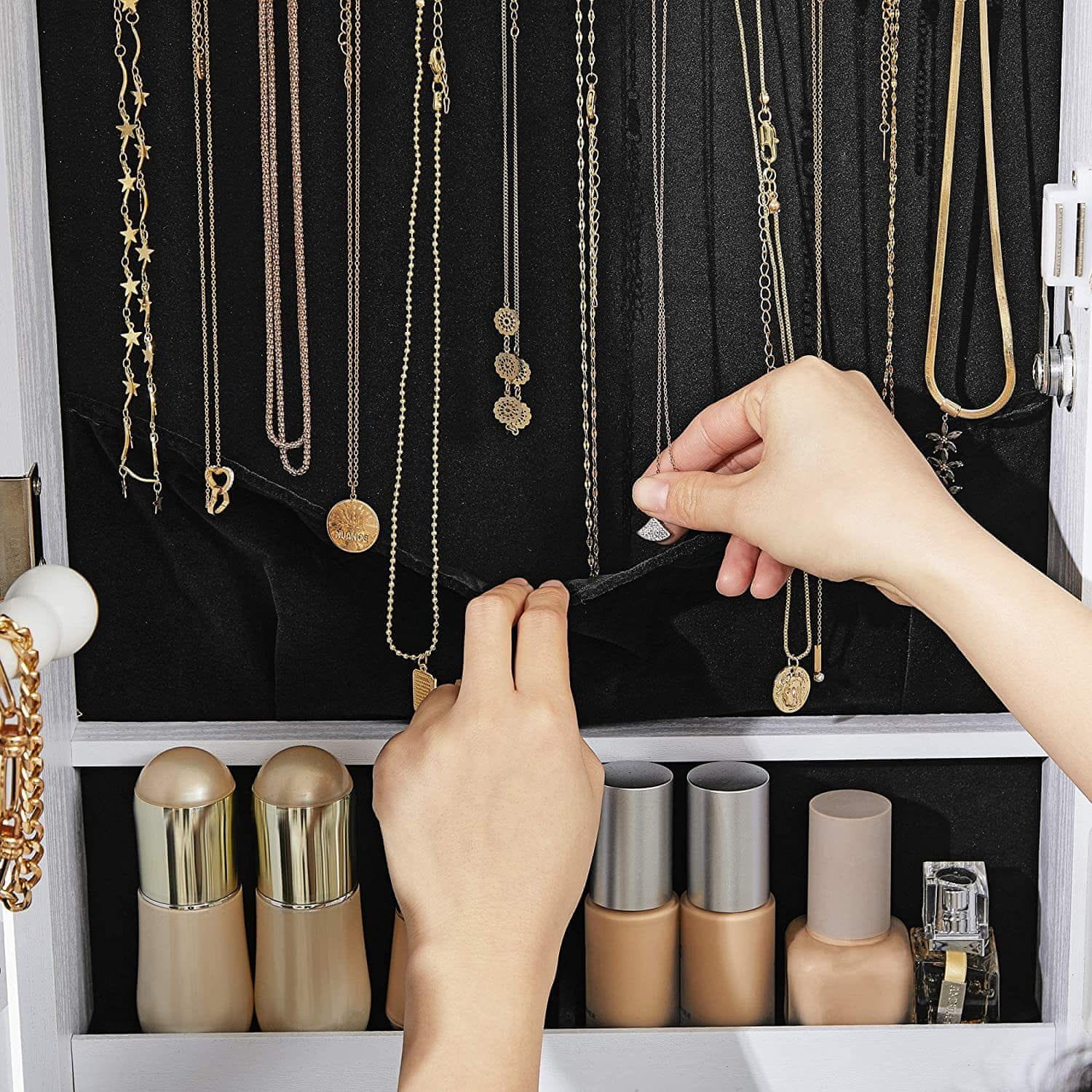 Edinstvena omarica za nakit, ki je nujna za vsako žensko, ki ceni priročnost in možnost, da svoj nakit in kozmetiko uredi na enem mestu. Omarica ima veliko ogledalo, kljuke za nakit in police, na katere lahko namestite številne kozmetične izdelke. Celoten opis
