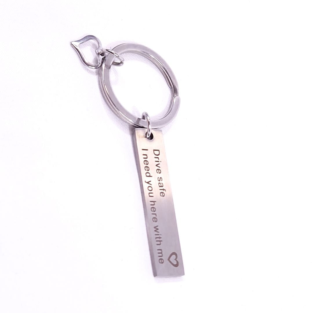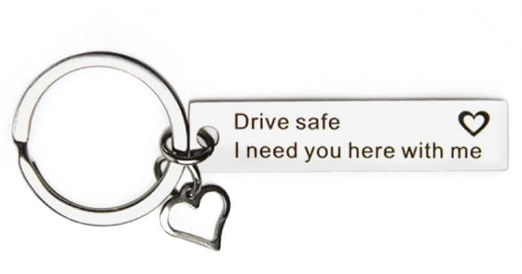 Obesek za ključe s prikupnim napisom je izvirno darilo, s katerim lahko razveselite vsakogar. Obesek z napisom „Drive safe. I need you here with me“ (prevod „Vozi varno. Potrebujem te ob sebi.“)
