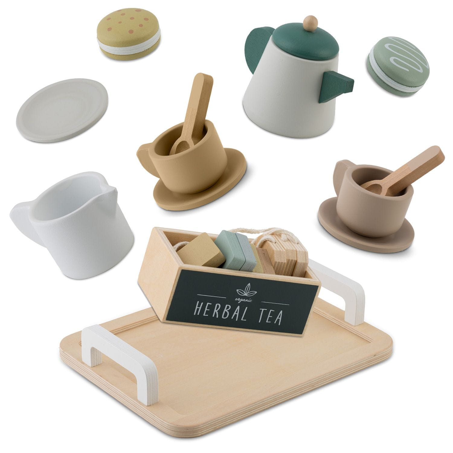 Izobraževanje in zabava! Set vsebuje visokokakovostne lesene elemente, kot so vrč, skodelice, žlice in servirni pladenj. Nanj lahko postrežete tudi makarone, v skodelice pa položite priložene čajne vrečke in s tem celotnemu prizoru dodate pristen pridih in otroku omogočite elegantno zabavo.