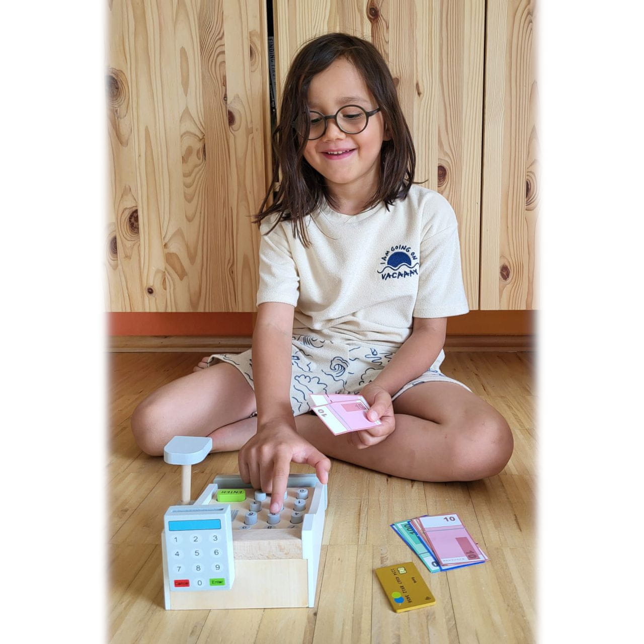 Denar se kar pretaka! Ta čudovita lesena blagajna sodi v vsako dobro organizirano otroško trgovino. Igra s to igračo otrokom pomaga razumeti cene blaga in ravnanje z denarjem. Vključeni so igračasti bankovci in lesene kreditne kartice, ki jih priročno spravite v spodnji predal. Ceno kupljenega blaga lahko vnesete na tipkovnici. Kdo je naslednji? Glavne značilnosti: lesena blagajna, vključno s skenerjem, čitalnikom kartic, igralnim denarjem in leseno kreditno karticouči otroke prepoznavati denarne zneske in ceneidealen dodatek za trgovino z igračamipodpira aktivno igro vlog in razvoj socialnih veščin otrok med igro
