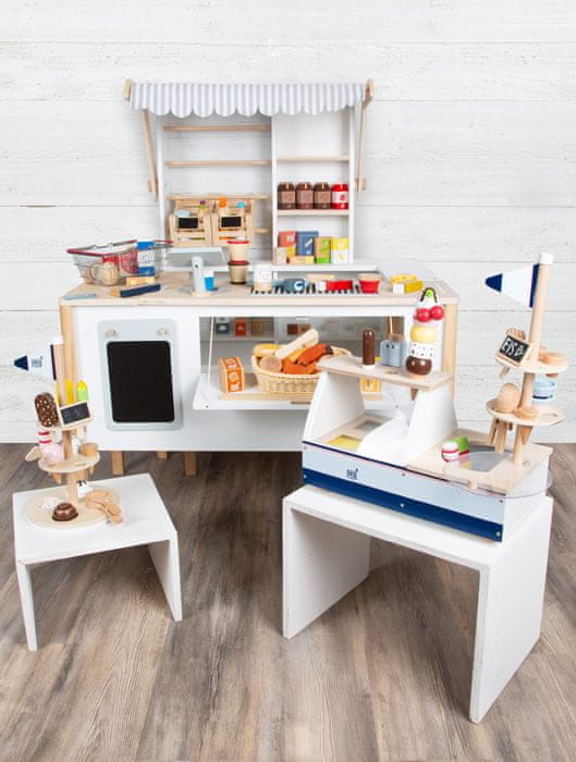 Merilnik za sladoled z magnetno funkcijo. 8 različnih vrst sladoleda, od sladoledov do slastnega sladoleda. Lopatice za sladoled je mogoče zlagati in so opremljene z magneti. Srčki iz vafljev in porcije stepene smetane za okrasitev sladolednih kreacij. Vse porcije sladoleda se prilegajo na barvno označena mesta na stojalu. Spolno nevtralna, nevsiljiva barvna shema z veliko vidnega lesenega materiala. Priložena je tabla za pisanje s kredo. Idealen dodatek k večnamenski trgovini in drugim igralnim živilom iz serije izdelkov Fresh. Glavneznačilnosti:Deli so magnetiziraniVse ima svoje mesto na stojaluRazvija otrokove komunikacijske in socialne spretnosti.