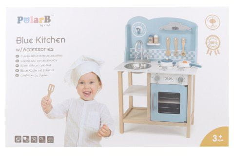 Drevesna kuhinja z dodatki, velikost 60 × 81 × 30 cm. Paket vključuje pomivalno korito, štedilnik, pečico, omarico, uro in druge dodatke. Dimenzije približno 60 × 37,5 × 15,5 cm. Starost 3+